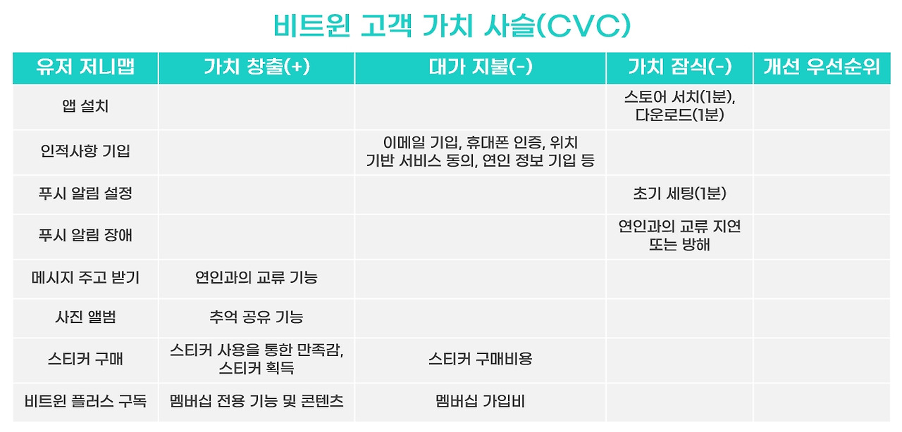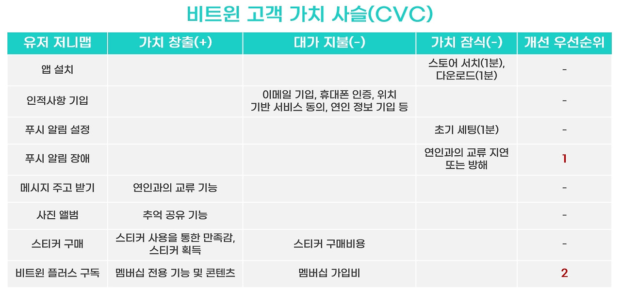 나는 5년째 커플 앱 <비트윈>을 사용하고 있다. 커플이라면 한 번쯤 거쳐 봤을 법한, 나처럼 계속 사용하거나 또는 어느 순간에 <카카오톡>에 밀려 삭제되었을지 모르는 앱이다. 가끔 알림이 안 와서 짜증이 나고, 어떨 땐 더 잘 됐으면 하며 측은하기도 하고, 한편으로는 이게 돈이 될까 싶은 생활 밀착형 앱인 <비트윈>을 고객가치와 사업가치라는 CVC(Customer Value Chain, 고객 가치 사슬) 측면에서 분석해본다.