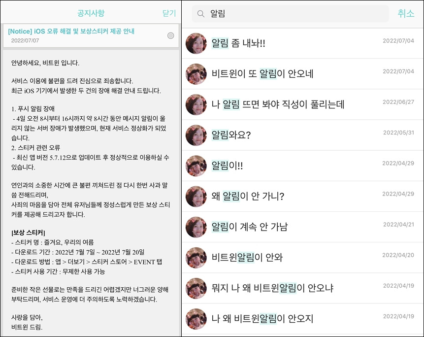 최근에도 4일에 푸시 알림 장애가 있었고, 그 사실을 3일이 지난 7일에야 공지했다. 비트윈은 늘 보상으로 스티커를 주는데 이것이 과연 적절한 보상일까에 대해 의문이 든다. 앱이 점차 무거워지는 걸까? 왜 알림이 이렇게 자주 안 되는지 모르겠지만 이건 비트윈이 해결해야 할 시급한 문제라고 생각한다.