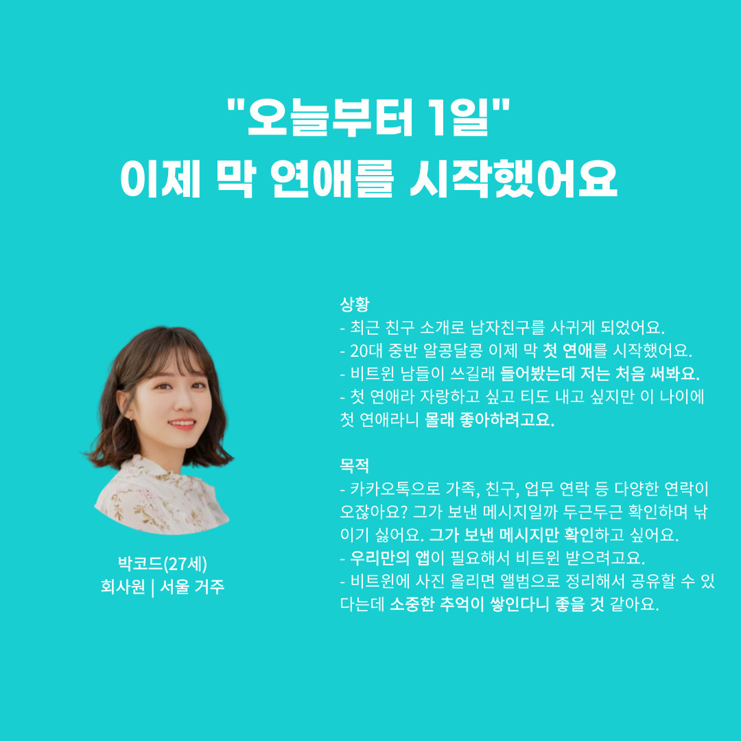 연애를 막 시작해서 비트윈이 필요한 여성으로 설정했다(성별). 막 연애를 시작한 사람이 비트윈을 더 의욕적으로 쓸 것이라고 생각했다.