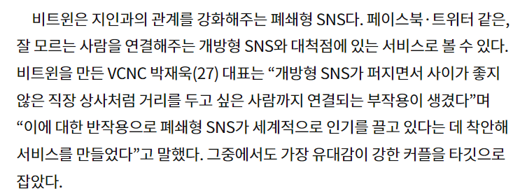 - (선정 이유) 개인적으로 카카오톡 다음으로 많이 사용하는 메신저이다. 연애시절에는 비트윈을 카카오톡 보다 더 많이 사용한 적도 있다. 오래 사용한 만큼 애정도 있지만 애정이 있는 만큼 서비스 불안정 등의 아쉬움이 남는 프로덕트이기 때문에 오늘 과제 프로덕트로 선정했다. 이러한 이유로 비트윈을 찾아보다가 비트윈이 작년에 크래프톤에 인수된 것을 알게 되었다. 게임 '배틀그라운드'로 유명한 게임회사가 비트윈을 왜 샀을까? 비트윈으로 뭘 하려는 걸까? 궁금증이 생겼다.