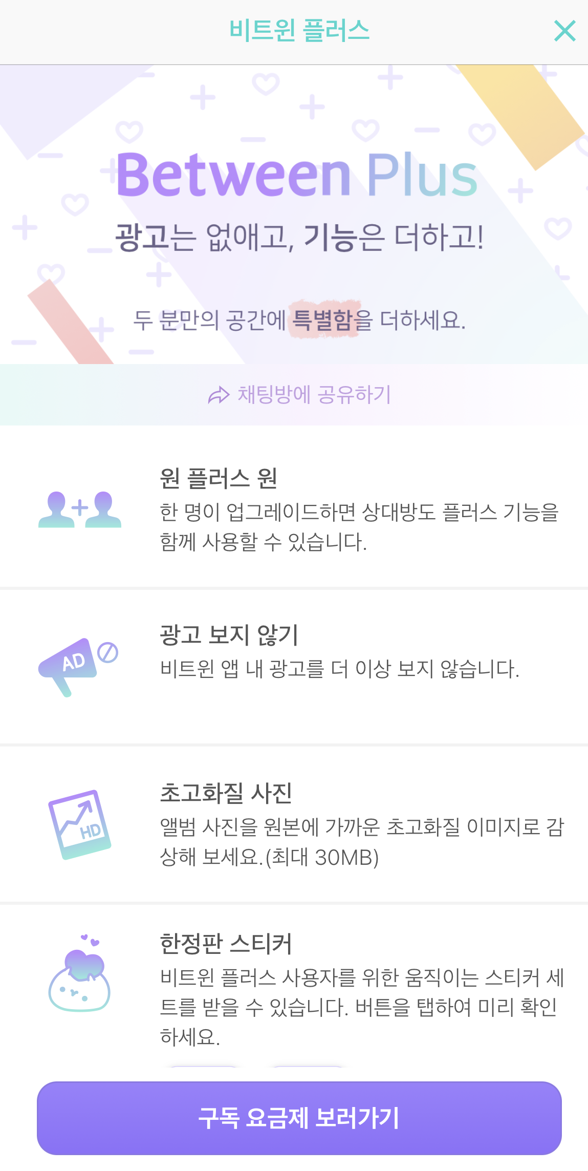비트윈 플러스의 코어 기능이라고 할 수 있는 광고 제거 기능 역시 매력적이지 않다. 영상을 재생할 때마다 광고가 2개씩 붙는 유튜브처럼 광고가 거슬릴 정도로 나오는 것도 아니고, 비트윈 메인화면 하단 정도에만 나오기 때문에 대화 중에는 광고 없이 클린 해서 생각보다 거슬리지 않기 때문이다.