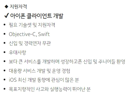 - 사실 클라이언트가 뭔지 전혀 감이 없어서 카카오톡 클라이언트 경력 개발자 모집 공고를 가져왔다. 안드로이드, IOS, 윈도우 버전 개발자를 각각 모집하고 있는 것을 알 수 있었다.