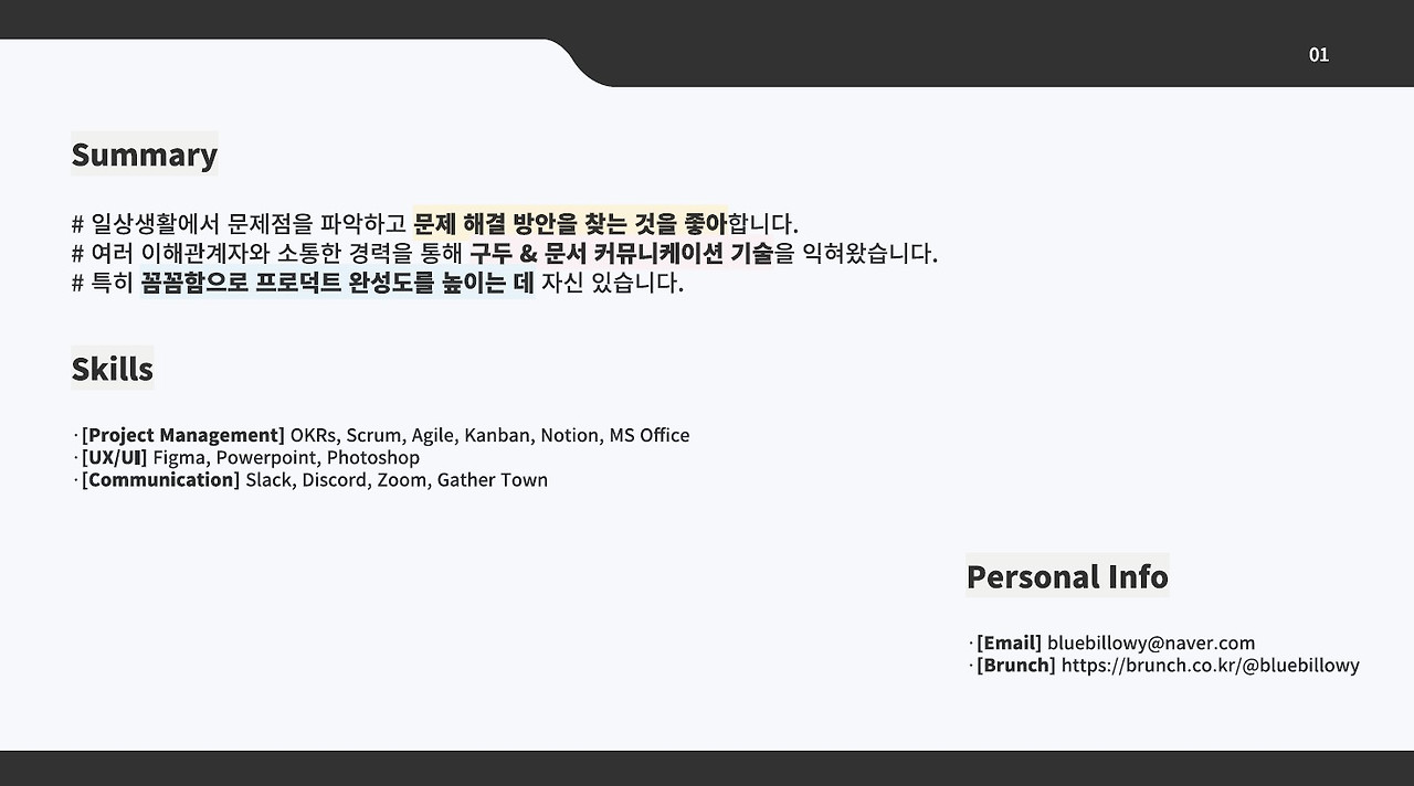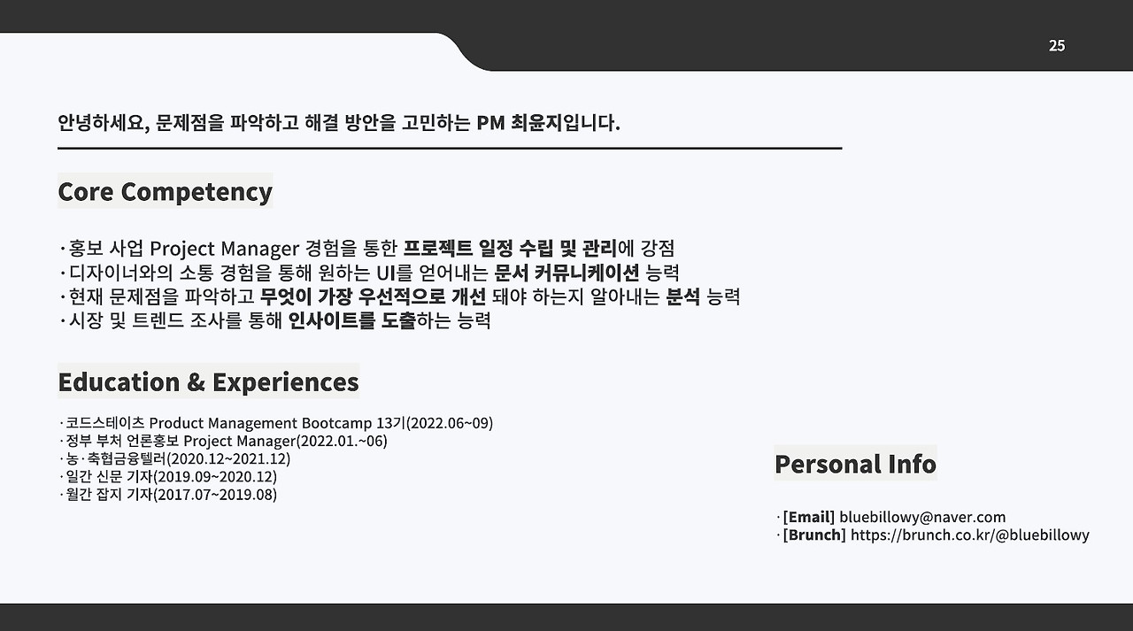 장점은 보증금이라는 강제성이 있어 어떻게든 PM포트폴리오를 만들게 됐다는 점이다. 보증금이 4만 원이라 이걸 날리기에는 너무 아깝다. 덕분에 26p 분량의 포트폴리오를 완성할 수 있었다. PMF 챌린지 2주 차는 팀원과 서로 포트폴리오 피드백을 주고받게 되는데 이 과정도 의미 있었다. 다른 사람에게 포트폴리오를 보여주고 진지하게 평가받을 수 있는 기회는 흔치 않으니까 말이다.