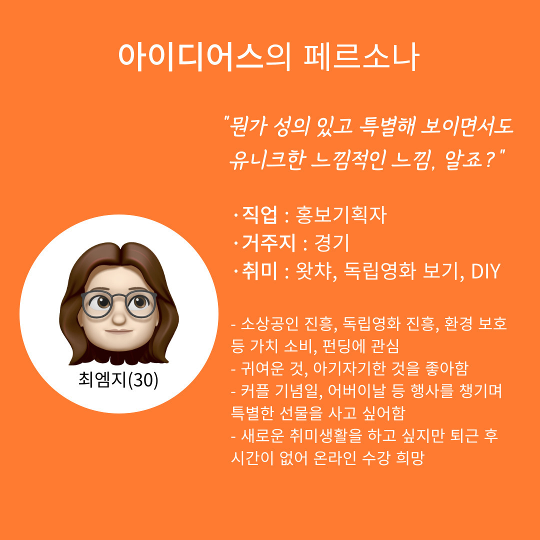 커플 기념일처럼 특별한 날, 나는 <아이디어스>에 들어간다. 뭔가 성의 있고 특별해 보이면서도 유니크한 느낌 때문에 이곳을 찾게 된다. 다른 사람들도 이렇게 생각하는 걸까? 아이디어스는 취향을 중시하는 MZ세대를 중심으로 성장했다. 코드스테이츠 PMB 13기 W2D1 과제는 페르소나다. 이번 포스팅에서는 온라인 수공예 플랫폼 아이디어스의 페르소나를 분석해보고자 한다.