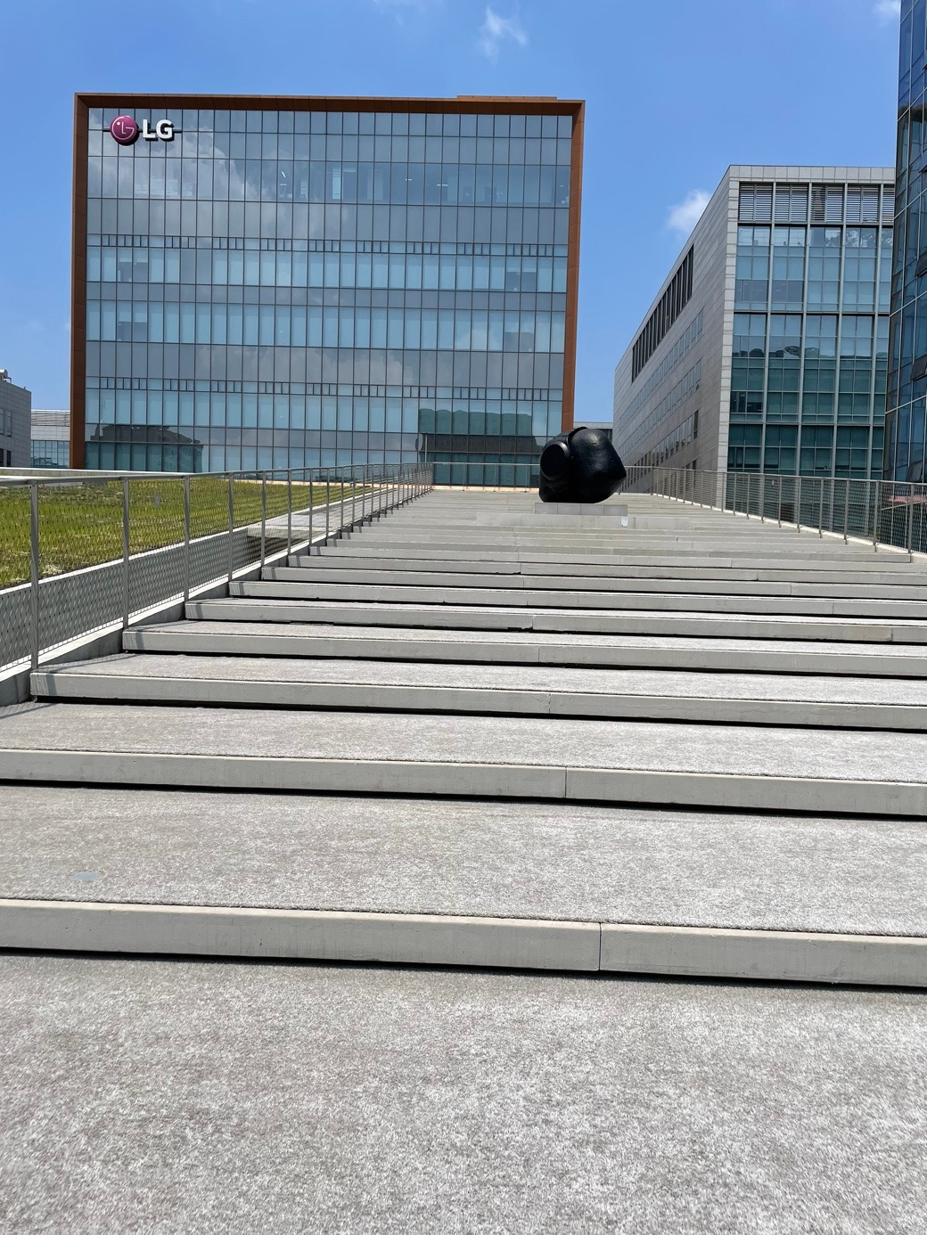 밖으로 나와 2층으로 올라서니 푸른 잔디가 지붕 위를 덮고, 주위를 둘러싼 고층 건물들이 마치 미술관을 품어 안은듯한 느낌이다. 넓게 펼쳐진 지붕 위에 계단에 '37년 전'이라는 조각작품이 주는 의미는 무엇일까?