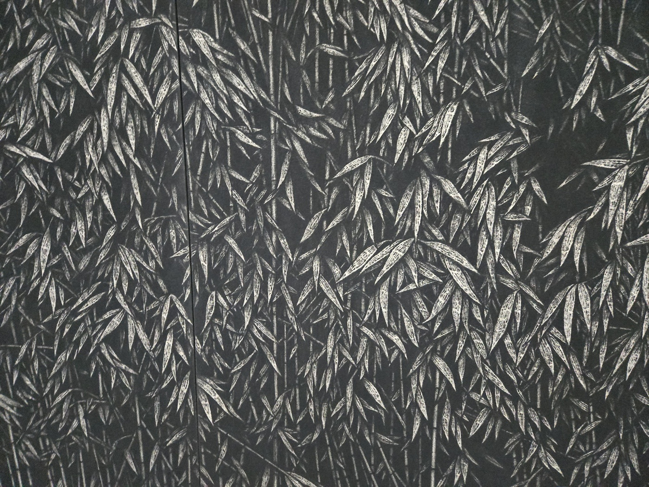 목탄과 검은색이라는 두 가지 키워드를 가지고, 자연과 인간, 빛과 어둠, 보이는 세계와 보이지 않는 세계 사이의 관계를 다층적으로 조망하는 작품이라고 하는데, 첫 느낌은 그저 암흑, 찬찬히 들여다보고 나니 모습을 드러내는 생명체의 모습(이파리, 줄기, 꽃등)이 빛을 받으며 조용히 드러나고 있다.