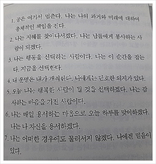 지금 이 순간부터 나는 나의 과거에 대하여 총체적인 책임을 진다. 나는 지혜의 시작이 내 문제에 대한 책임을 받아들이는 것임을 안다. 내 과거에 책임을 짐으로써 나는 나 자신을 과거로부터 해방시킬 수 있다. 내가 스스로 선택한 더 크고 밝은 미래로 나아갈 수 있다. - 중략 -