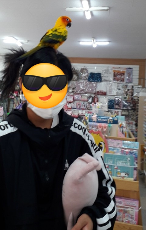 다음은 앵무새를 머리에 얹고 다니는 손님이다. 이 손님이 간혹 가게 앞을 지나다니길래 신기해서 몇 번 봤었는데, 어느 날 우리 가게를 방문해 주셨다. 너무 신기해서 양해를 얻고 사진 한 장을 찍었다.