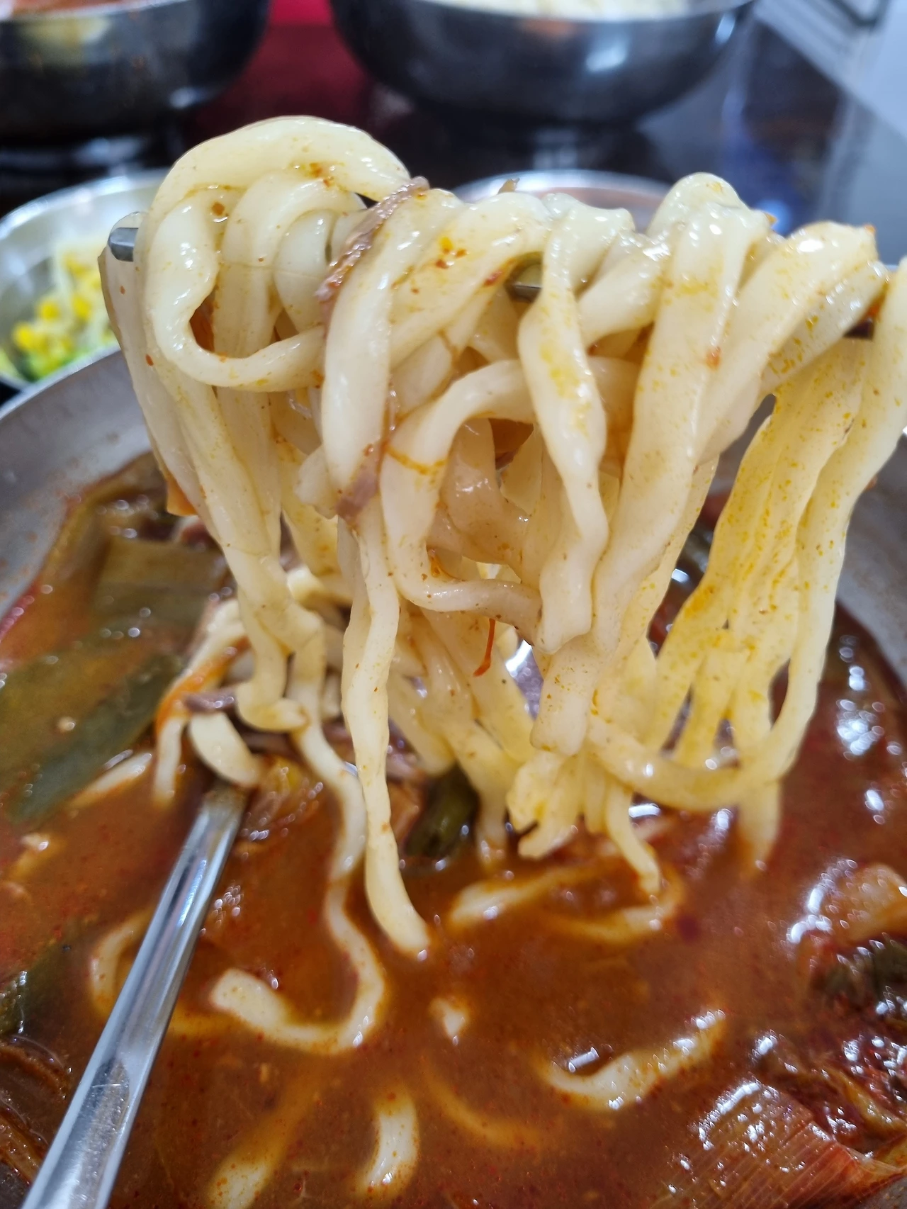 걸쭉한 국물과 사골육수의 간이 적당히 묻은 통통하고 쫄깃한 칼국수. 퐁당퐁당 칼국수를 육개장에 넣을 때마다 하얀 면이 붉게 물든다. 빨간 옷을 입은 면을 휘휘 저어주면 맛깔난 감칠맛까지 면발에 찰싹 붙어버린다. 그때 입으로 넣어주면 끝. 한 젓가락이 다음 젓가락을 어서 오라 손짓하는 맛있는 육칼이 완성된다. 칼칼함이 툭툭 목젖을 치고 넘어가면 쫄깃한 면발이 얼른 국물을 따라나선다. 후루룩 넘어가지 않도록 꼭꼭 씹어서 삼킨다.