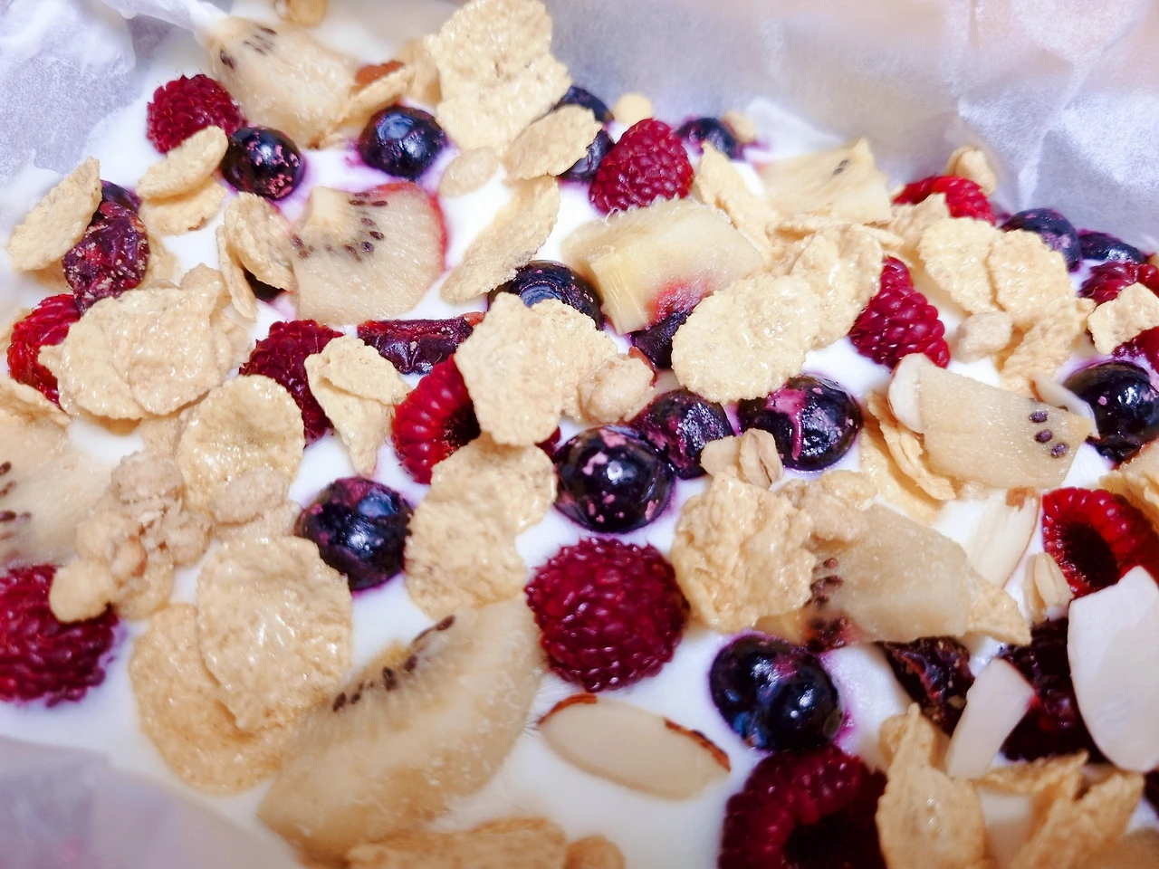 자 이제 요거트 바크 이미지를 머릿속에 딱 띄워놓고 만들기 시작. 그릭 요거트를 종이포일 위에 넓게 그리고 고르게 펴기 시작했다. 장비가 뭐가 필요한가. 집에 있는 것으로 만드는 게 역시 최고 아닌가. 일단 숟가락으로 슥슥 하얀 도화지를 만든다. 요거트의 질감이 주는 폭신한 부드러움이 손끝으로 전해진다. 하얀 도화지 위에 상큼한 과일을 차례대로 올려 본다. 일단 씻어두었던 산딸기를 톡톡톡톡 뿌려주고, 냉동실에 있던 블루베리도 한 줌 꺼내본다. 빨간 산딸기 옆 빈자리를 보라색 블루베리가 친한 친구처럼 가까이에 자리한다. 베리 옆에 더 예쁜 베리라는 말은 이럴 때 쓰는 건가. 보고만 있어도 예쁜 조합이다.