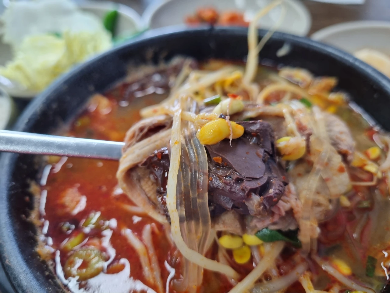 부드러운 국물색을 띠지만 섞으면 자극적인 붉은 국물색으로 변한다. 선지가 얼마나 큰지 절반은 남편에게 덜어 주었다.