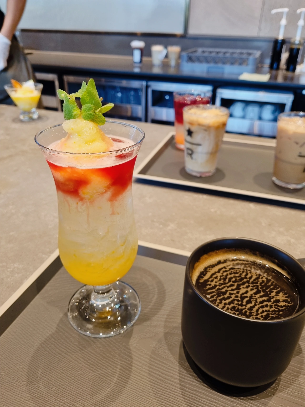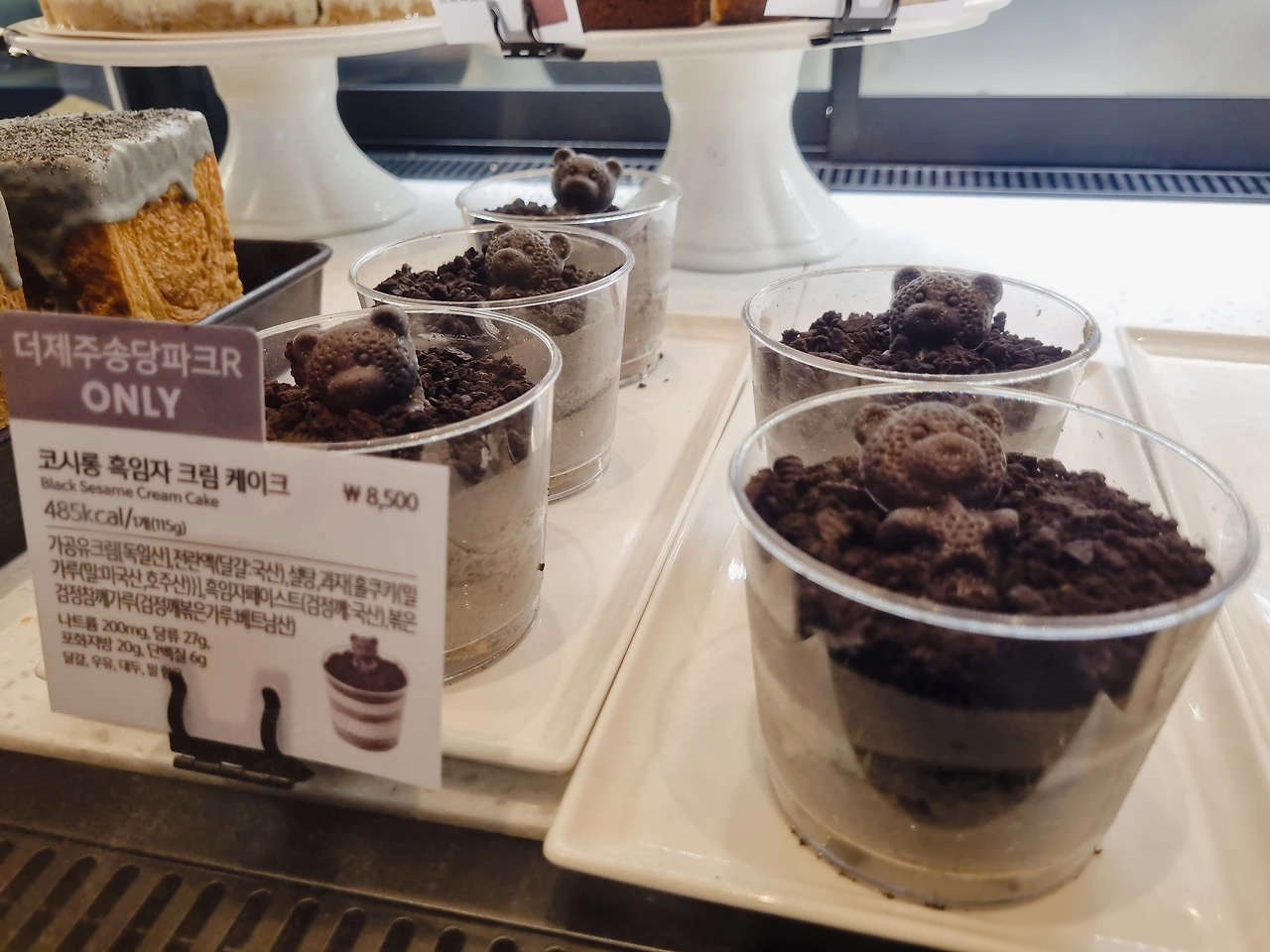 오늘은 송당점 온리 메뉴인 '제주 팔삭 셔벗 피지오' 이름 길지만 예쁜 음료도 함께 주문했다. 이곳에서만 즐길 수 있는 리저브 온리 음료였다. 일반 플라스틱 잔이 아닌 예쁜 유리잔에 영롱하게 담긴 음료와 외부의 공원 그리고 하늘의 색까지 섞이기 시작하니 한 폭의 그림같이 다가왔다.