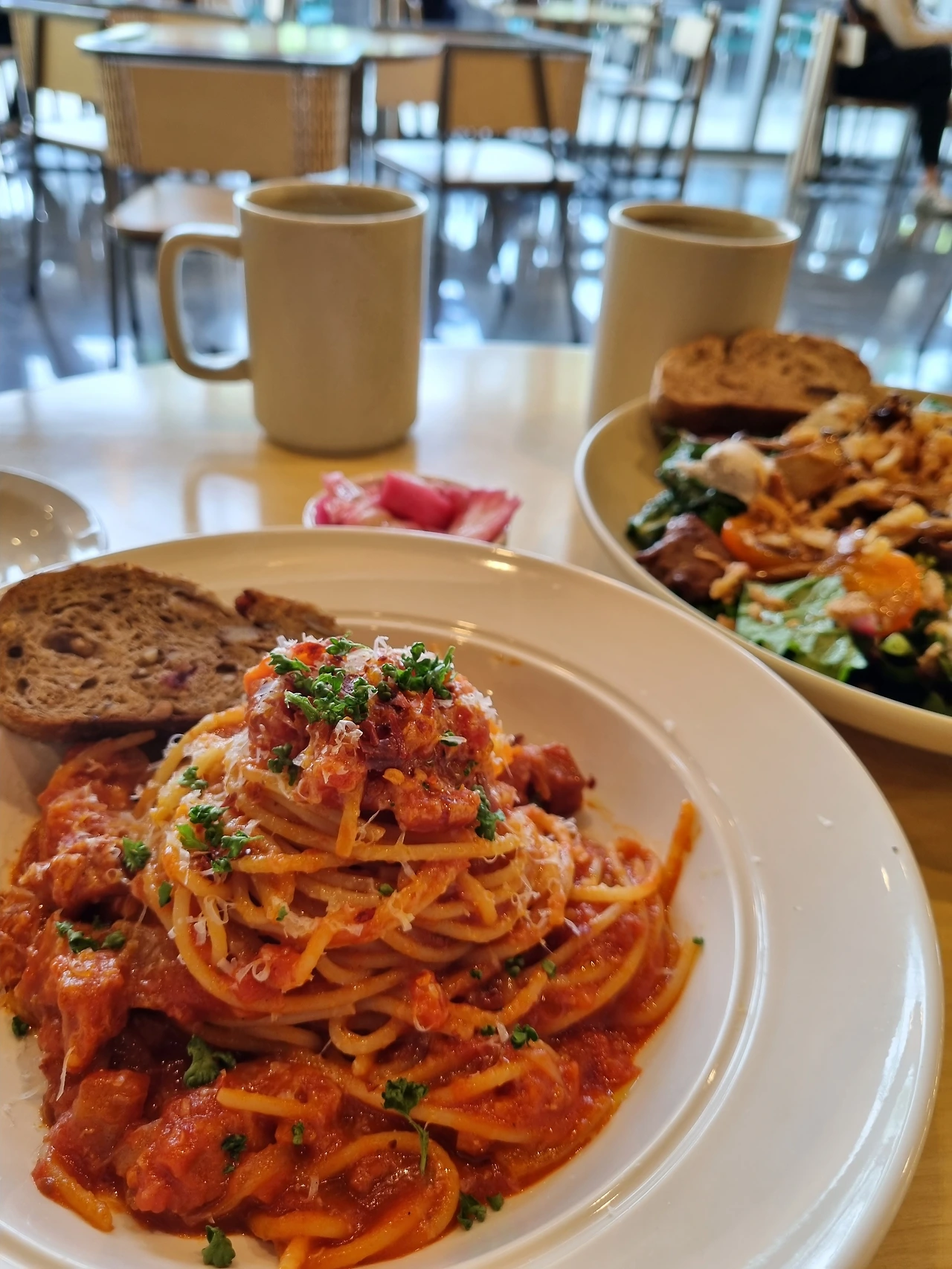 따뜻한 커피와 버섯과 야채, 토마토, 트러플 향이 나는 치즈, 스테이크가 함께 있는 샐러드, 아마트리치아나 스파게티까지 아내와 첫째가 함께 있는 이 시간이 나에겐 어색하지만 좋다. (둘째가 잠시 떨어져 있어 여유로움이 극대화된 것 같다. 아빠가 사랑하는 거 알지, 둘째)