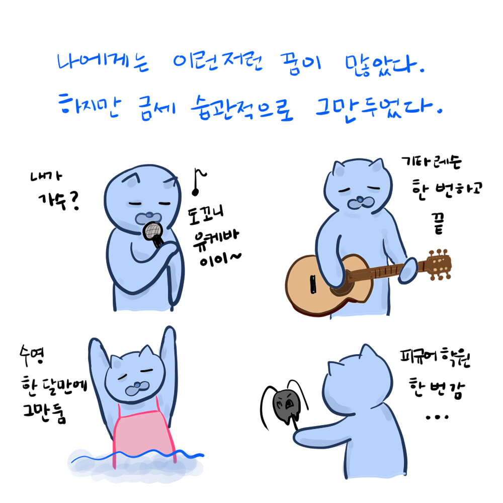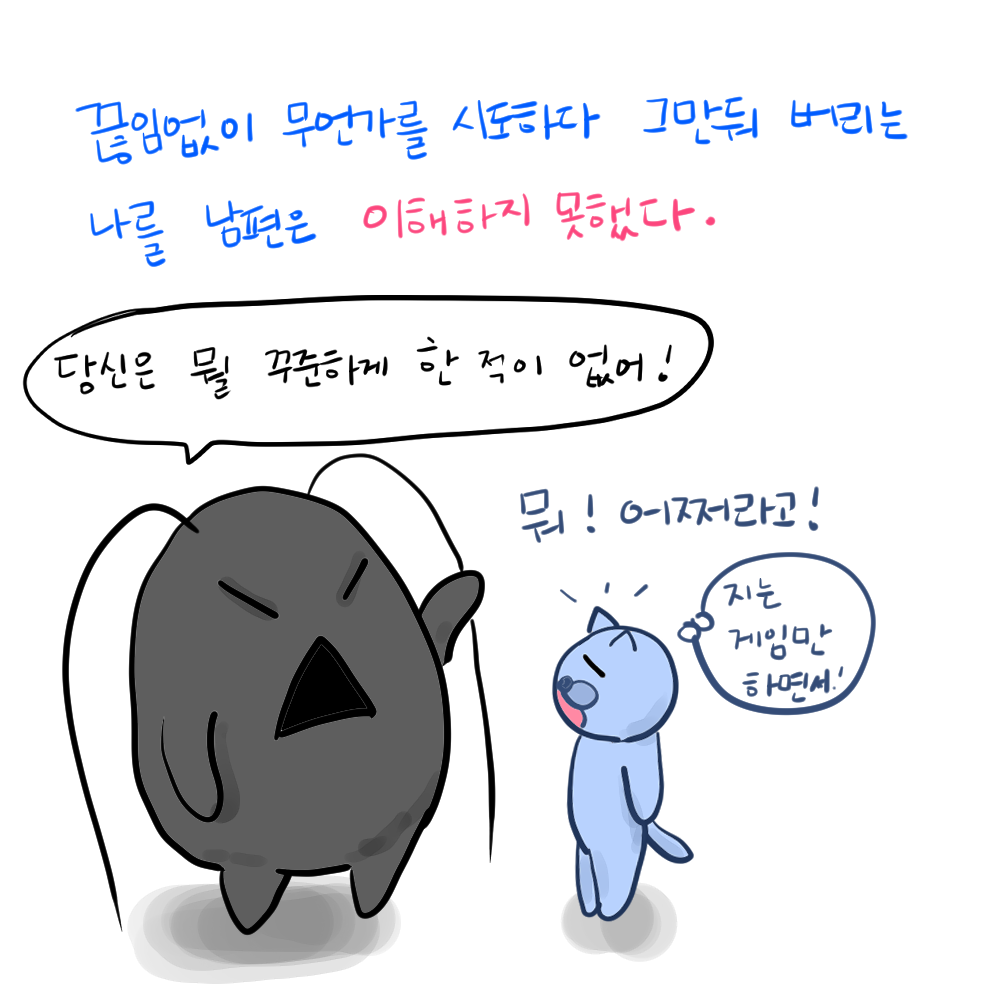 나는 뭔가를 해보려고 이런 시런 시도를 해왔었다. 그 일에 시간과 모든 에너지를 쏟다가 스스로가 산화되어 그만두기 일쑤였다. 늘 꾸준함 없이 중도에 그만둬버리는 어떤
