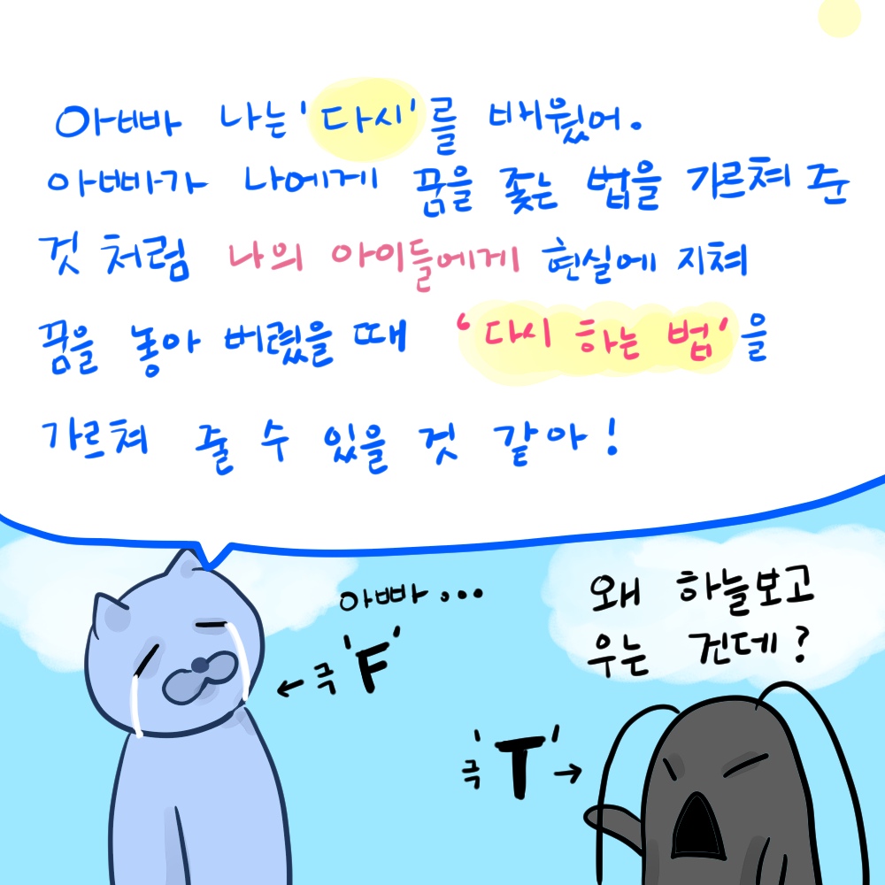 나의 아이들에게는 현실에 지쳐 꿈을 놓아 버렸을 때 다시 하는 법을 가르쳐줄 수 있을 것 같아!"