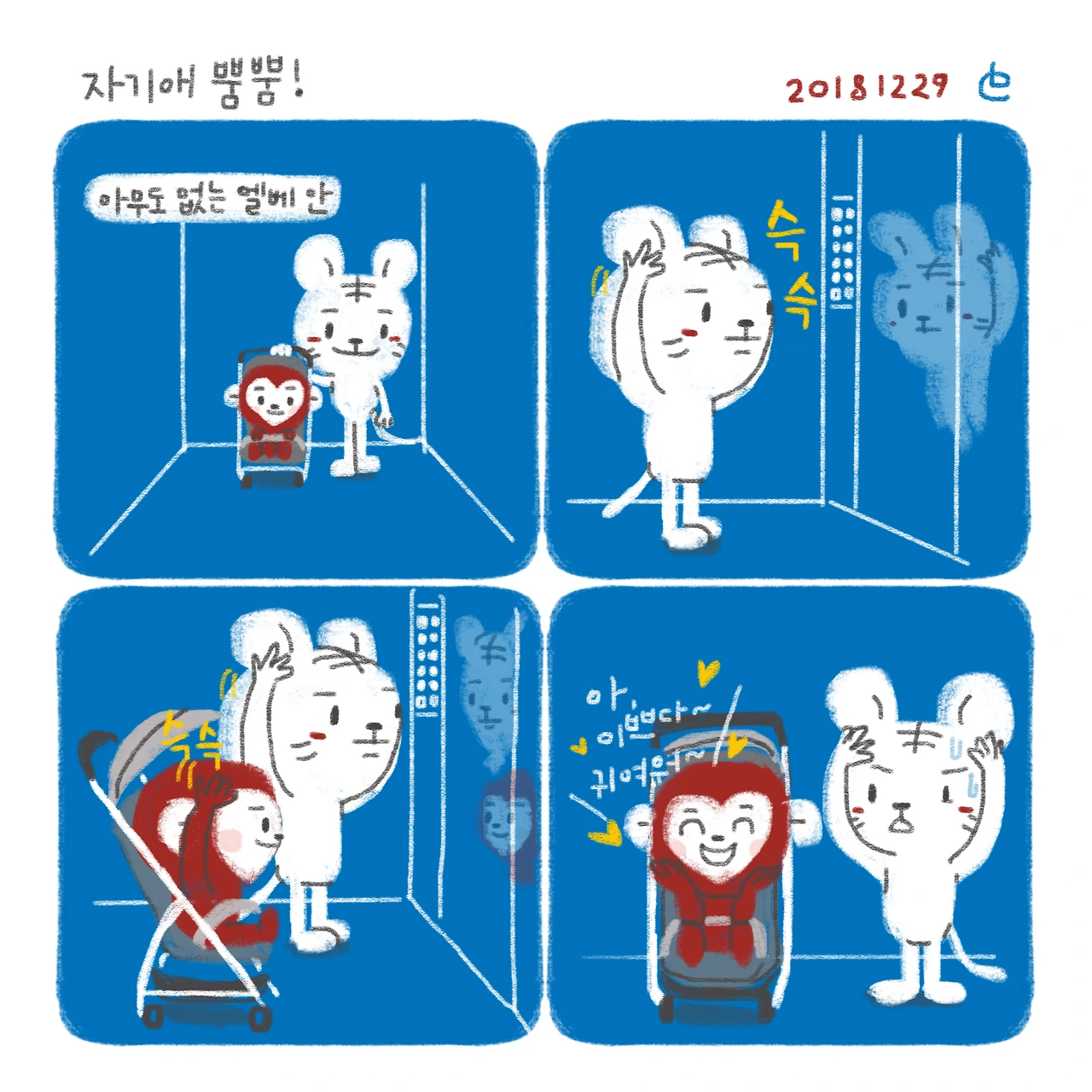 슉슉이가 자기 자신을 사랑하는 표현을 하기 시작했다..!엘리베이터 문에 비친 자기를 보며 아, 이뻐~ 아, 귀여워~ 말하는데 어찌나 사랑스러운지 모른다ㅋㅋ-#그림일기 #일상툰 #네컷일기#육아일기 #26개월아기#자기애뿜뿜#블루챔버 #bluechamber