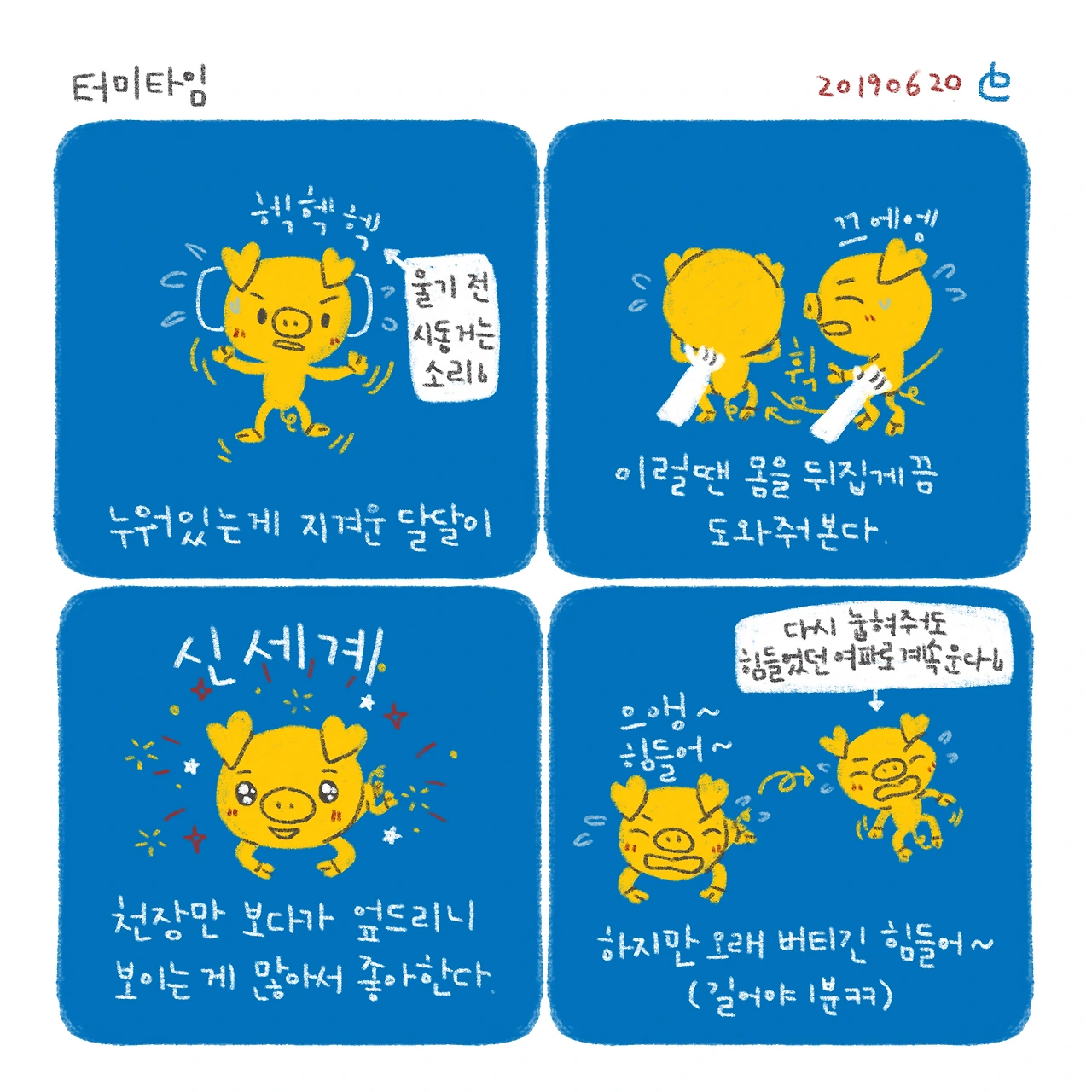 슉슉이는 이맘때 뒤집기한다고 용썼는데 달달이는 아직 그럴 기미가 1도 없다.ㅋㅋ애는 힘들다고 앵앵대는데 그게 마냥 귀여운 나란 엄마..ㅋㅋ-#블루챔버 #bluechamber #일상툰 #육아툰 #육아일기 #남매맘 #황금돼지띠아기 #생후85일 #터미타임