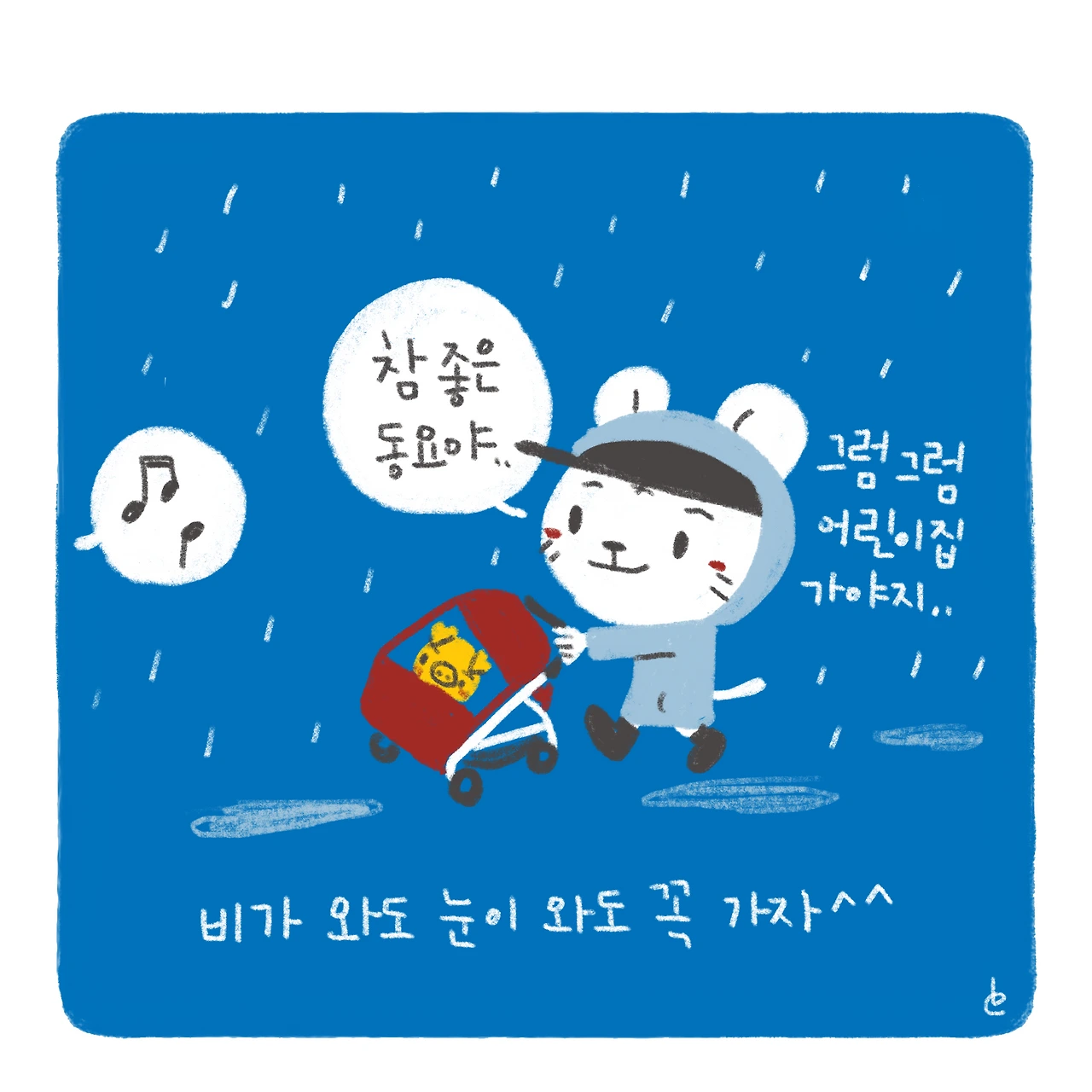 이제 우산 쓰고 제법 오래 걷는 슉슉이 덕분에 비 오는 날에도 같이 다니기 좀 수월해진듯 하다.-#블루챔버 #bluechamber #그림일기 #육아일기 #일상툰 #남매맘 #애둘맘 #비가와도어린이집 #34개월아기 #붉은원숭이띠