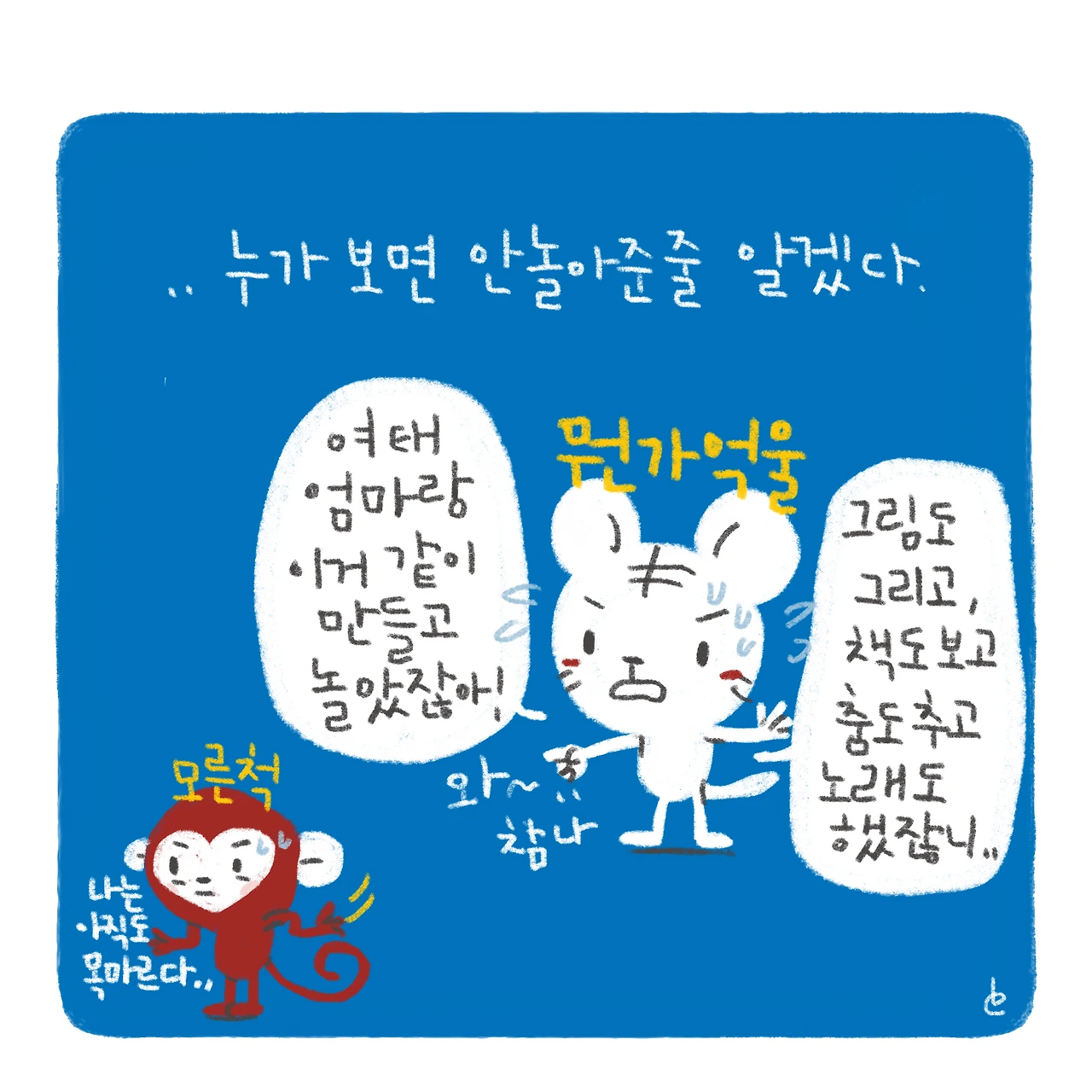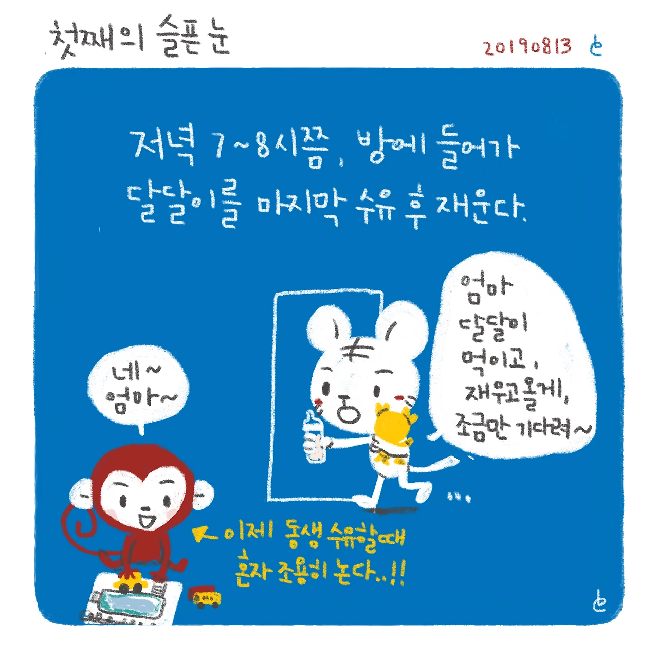 더 이상 뭘 어떻게 놀아줘야하니..?ㅋㅋ..너랑 노느라 동생을 방치하고 있는 것 같아서 오히려 동생에게 미안해하고 있었는데 이게 무슨 소리더냐..!-#블루챔버 #bluechamber #그림일기 #육아일기 #일상툰 #남매맘 #애둘맘 #첫째의슬픈눈 #34개월아기 #붉은원숭이띠