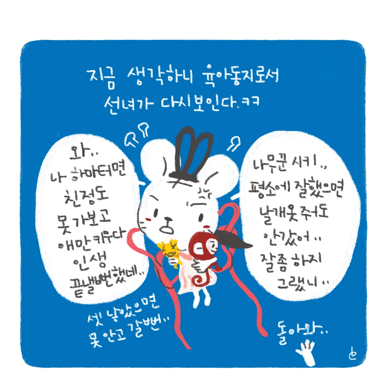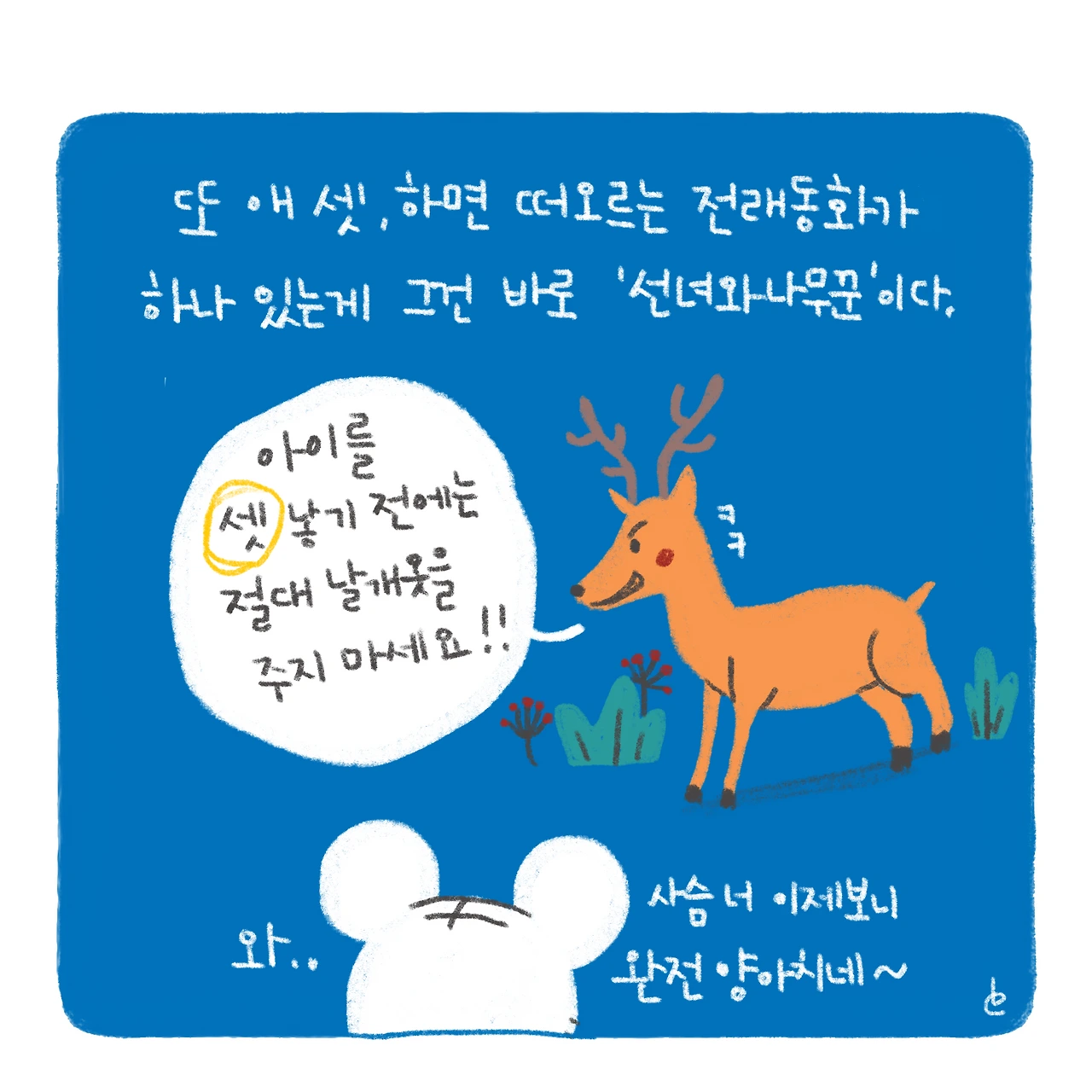 나무꾼이랑 사슴 보면 볼수록 별로고..ㅎㅎ지금 다시 보면 ‘선녀와나무꾼’ 말고도 참 답답한 동화들이 많다..시대가 변했는데 옛날 동화들을 굳이 요즘 아이에게 보여줘야하나 싶기도 하다..-#블루챔버 #bluechamber #그림일기 #육아일기 #일상툰 #남매맘 #애둘맘 #애가셋이라면 #34개월아기 #4개월아기