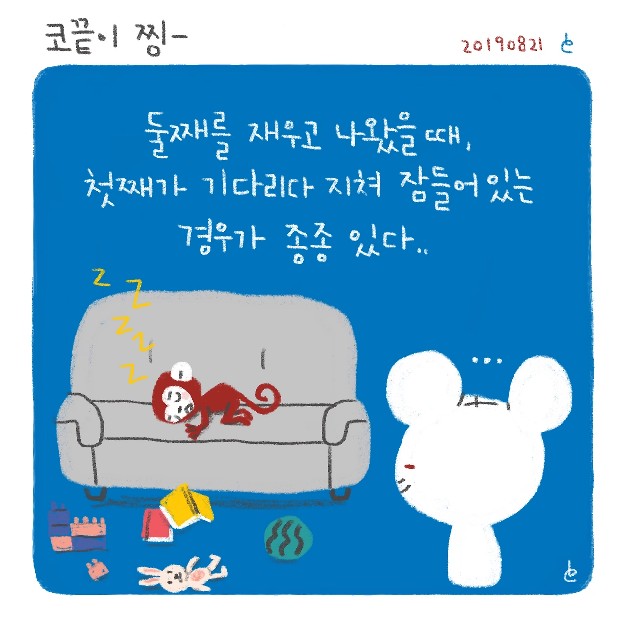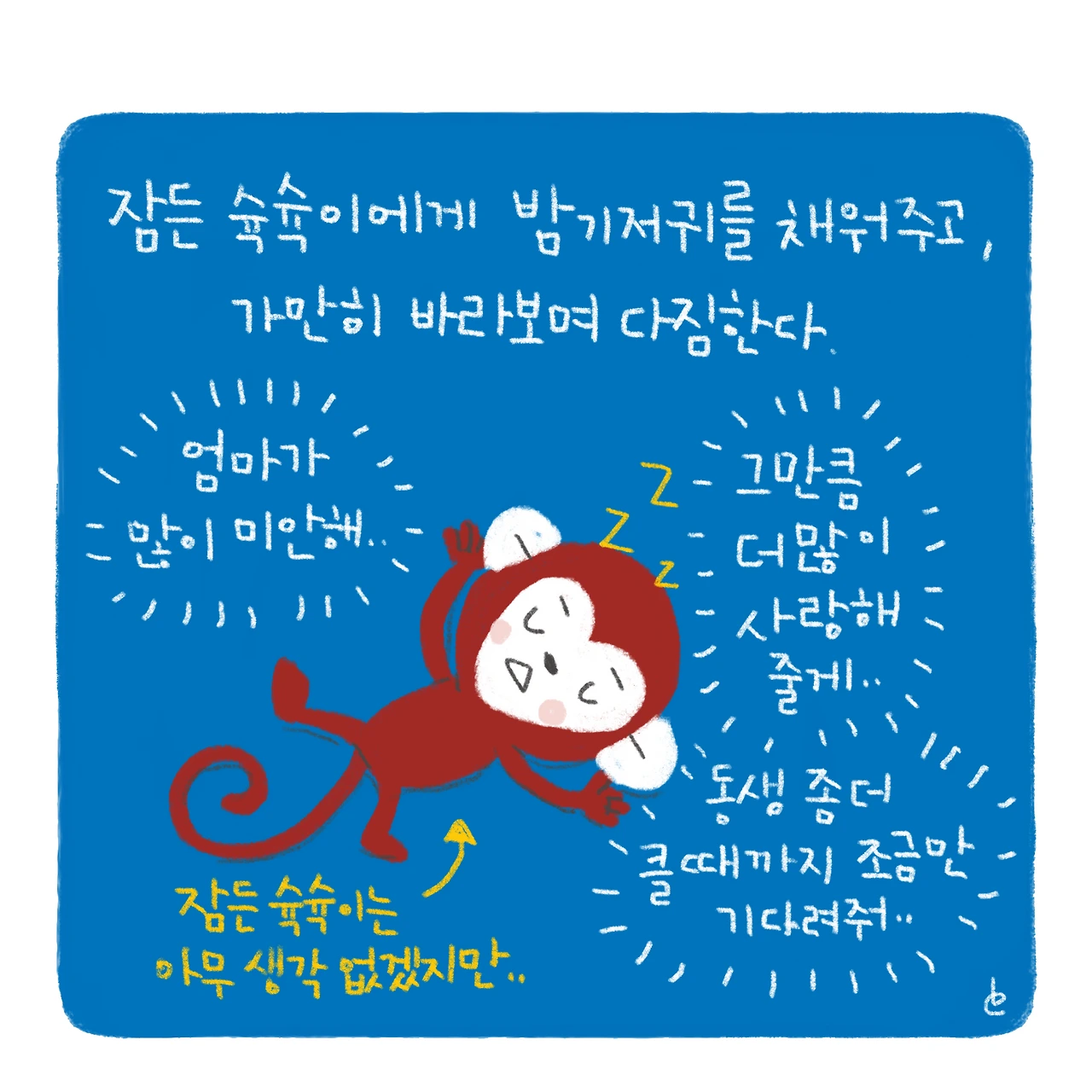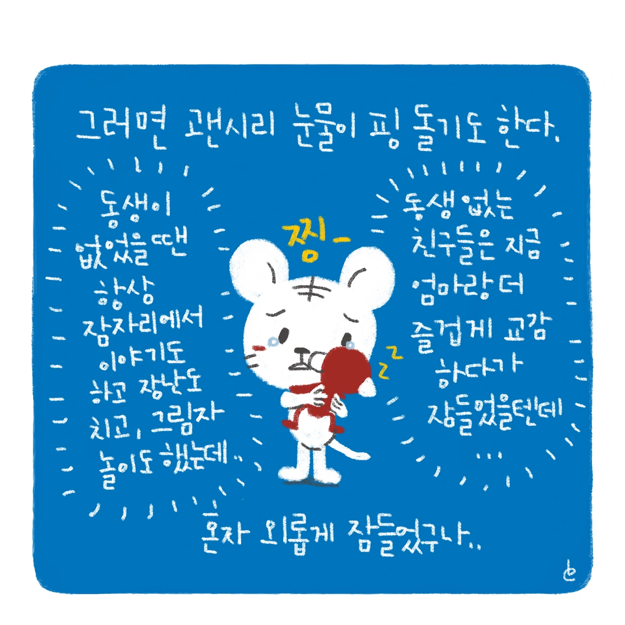 이게 뭐라고 그림을 그리면서도 울컥울컥(..)애는 별 생각 없을 수도 있는데, 괜히 미안한 마음에 더 오바해서 바라보게 되는 것 같다.나중에 동생 더 크면 셋이서 재밌게 놀다가 자자꾸나..!!-#블루챔버 #bluechamber #그림일기 #육아일기 #일상툰 #남매맘 #애둘맘 #코끝이찡 #34개월아기 #4개월아기