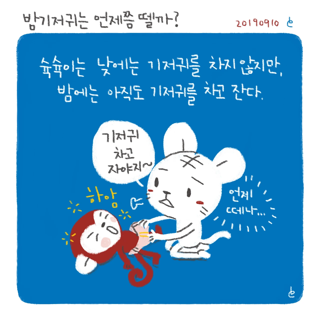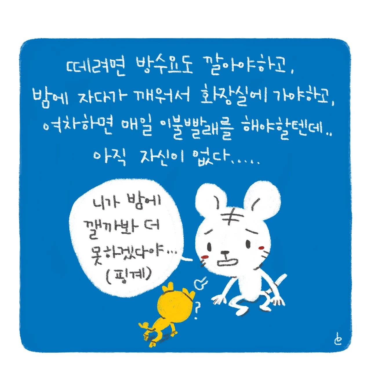밤기저귀가 한 일주일 정도 안젖게되면 그때 떼면 되지 않을까..?애나 엄마나 서로 스트레스 안받고 자연스럽게 뗄 수 있으면 좋겠다.-#블루챔버 #bluechamber #그림일기 #육아일기 #일상툰 #남매맘 #애둘맘 #5개월아기 #35개월아기 #밤기저귀는언제쯤뗄까