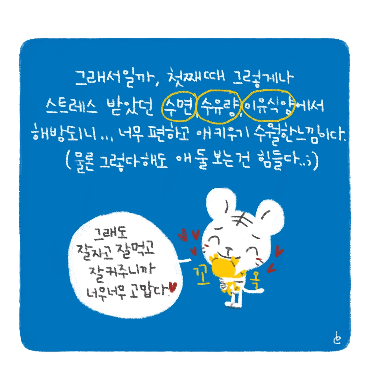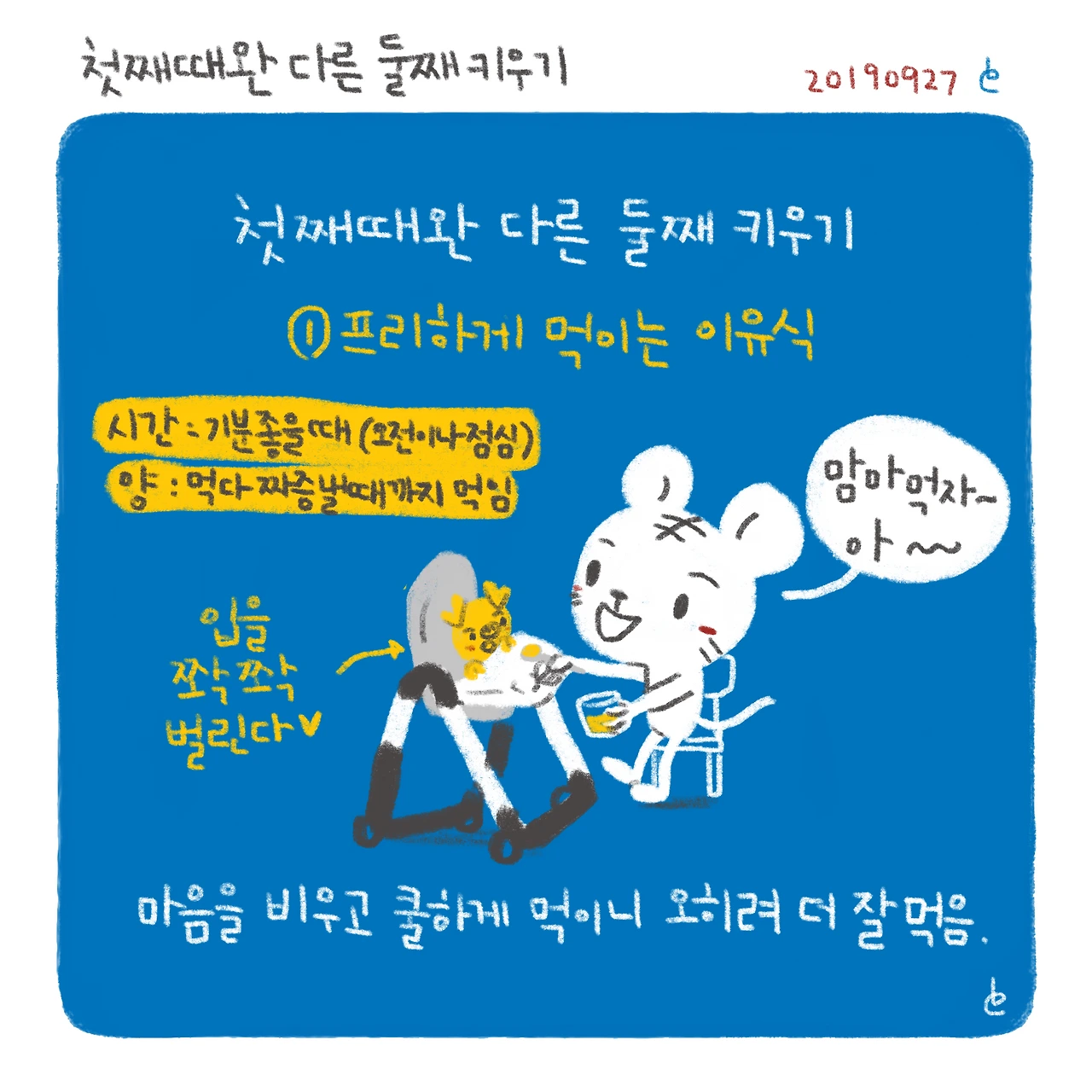 확실히 스트레스를 덜 받으니 그만큼 더 이뻐할 여유가 생기는 것 같다.그래서 둘째는 사랑이라고 하는가보다.-#블루챔버 #bluechamber #그림일기 #육아일기 #일상툰 #남매맘 #애둘맘 #5개월아기 #생후184일 #첫째때완다른둘째키우기