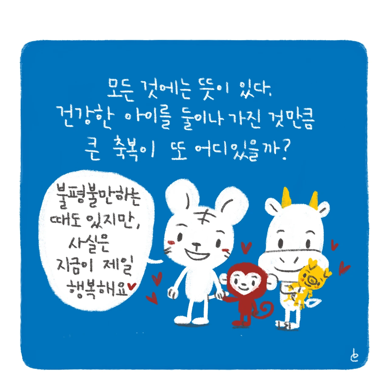 소띠 아빠, 호랑이띠 엄마, 원숭이띠 딸, 돼지띠 아들. 소소한 육아와 일상 이야기를 그리고 있습니다.