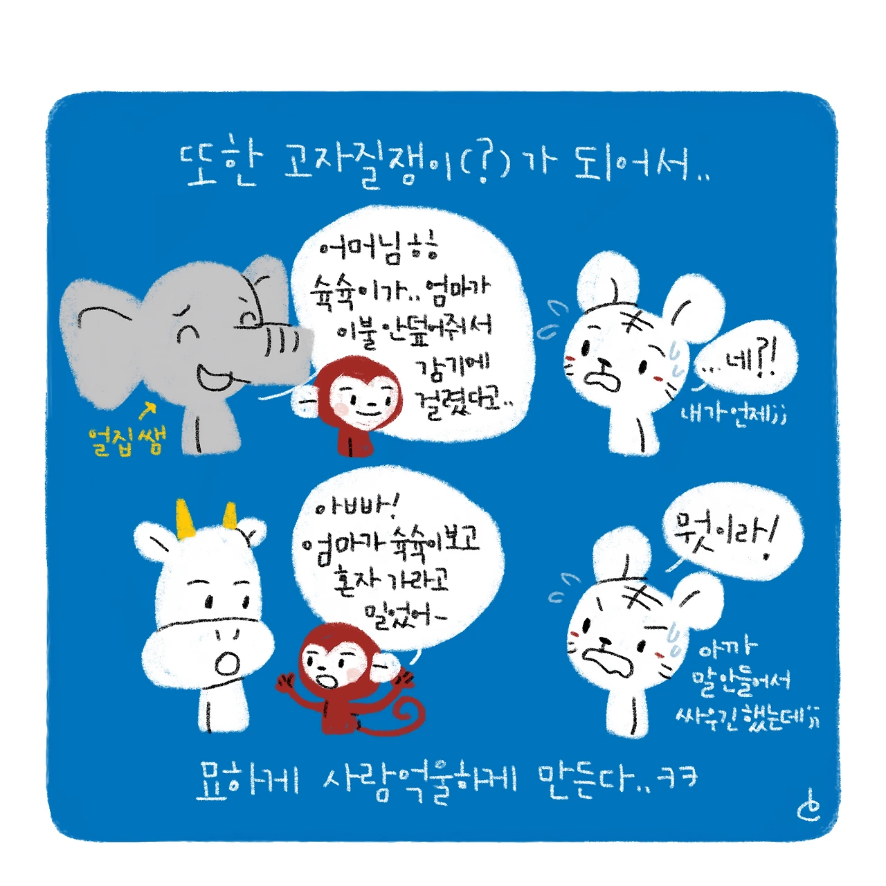 소띠 아빠, 호랑이띠 엄마, 원숭이띠 딸, 돼지띠 아들. 소소한 육아와 일상 이야기를 그리고 있습니다.