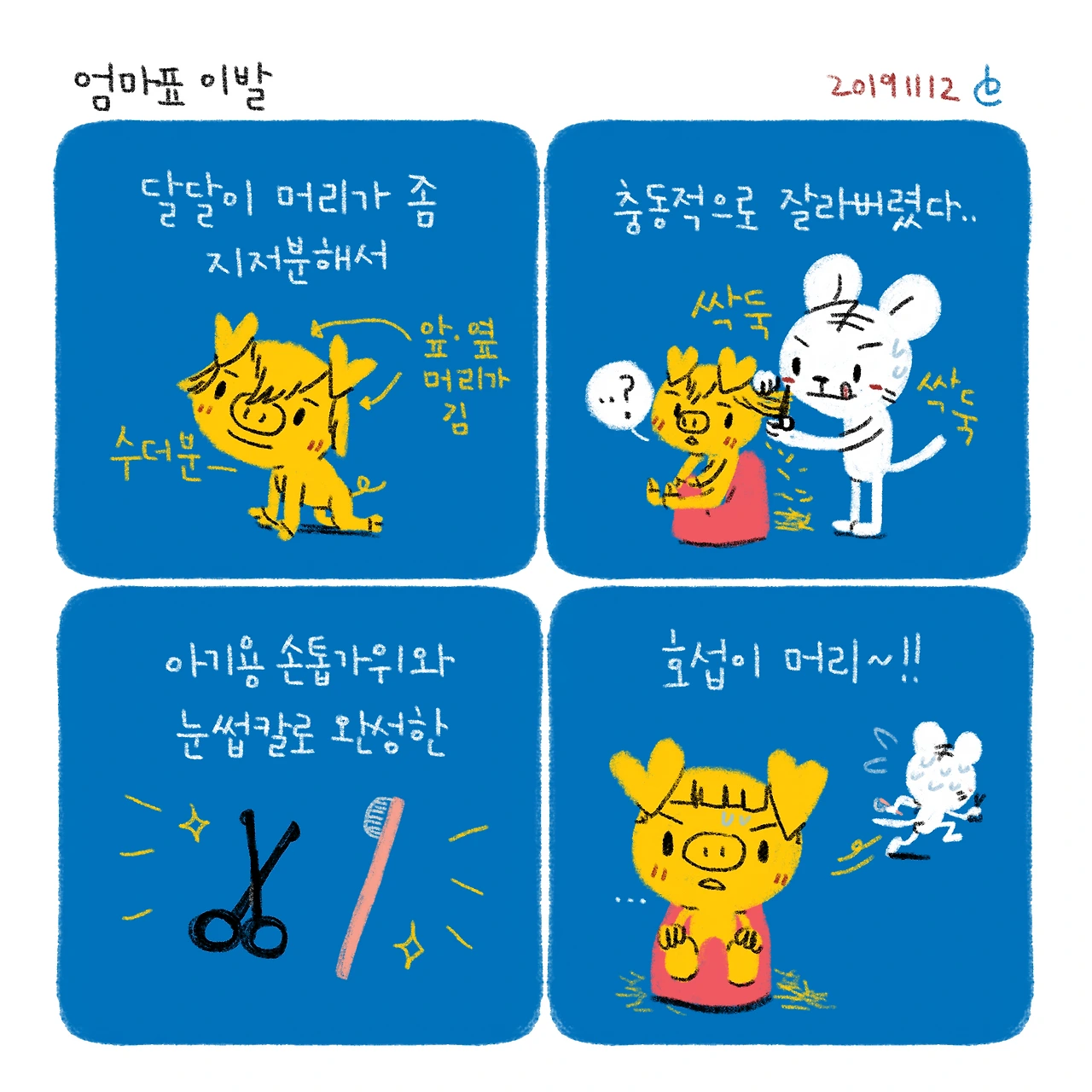 사랑아~ 호섭해~~!! ㅋㅋㅋㅋ괜찮아, 머리는 금방 길어..(..)-#블루챔버 #bluechamber #그림일기 #육아일기 #일상툰 #남매맘 #애둘맘 #37개월어린이 #7개월아기 #엄마표이발