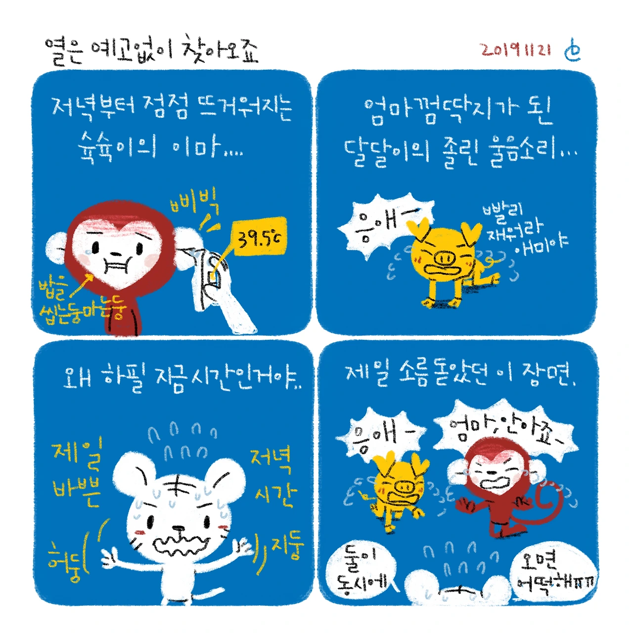 열 나면 항상 불길한 예감이 든다..밤에 너무 정신없이 둘 다 재우다보니 슉슉이는 자다가 이불에 쉬를 해버리고, 해열제 먹이며 밤보초 섰는데 열이 약 먹을때만 사그라들고 시간 지나면 다시 오르는게, 영 불길하다ㅠㅠ제발 무탈히 넘어가소서..ㅠㅠ-#블루챔버 #bluechamber #그림일기 #육아일기 #일상툰 #남매맘 #애둘맘 #37개월어린이 #7개월아기 #열은예고없이찾아오죠