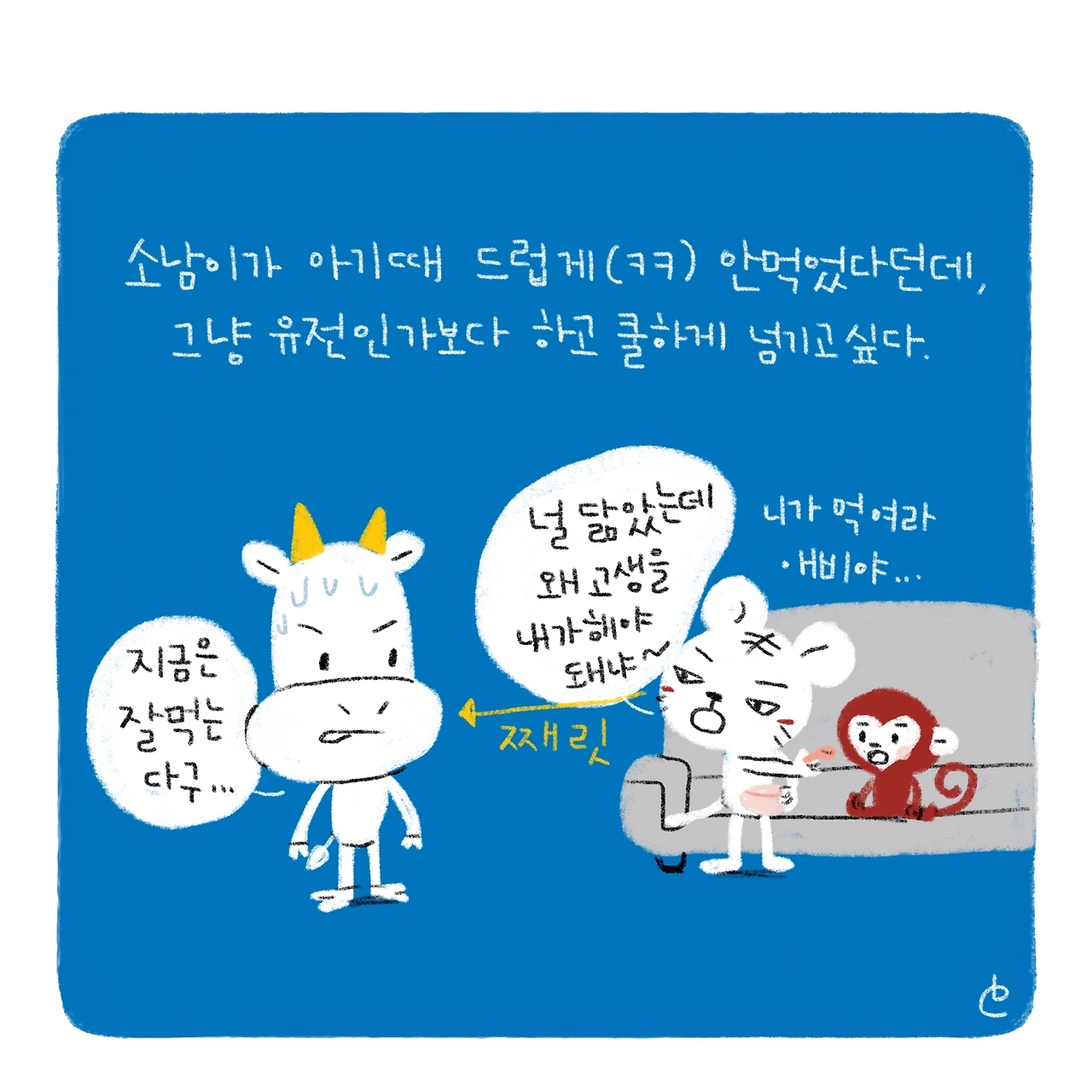 소띠 아빠, 호랑이띠 엄마, 원숭이띠 딸, 돼지띠 아들. 소소한 육아와 일상 이야기를 그리고 있습니다.