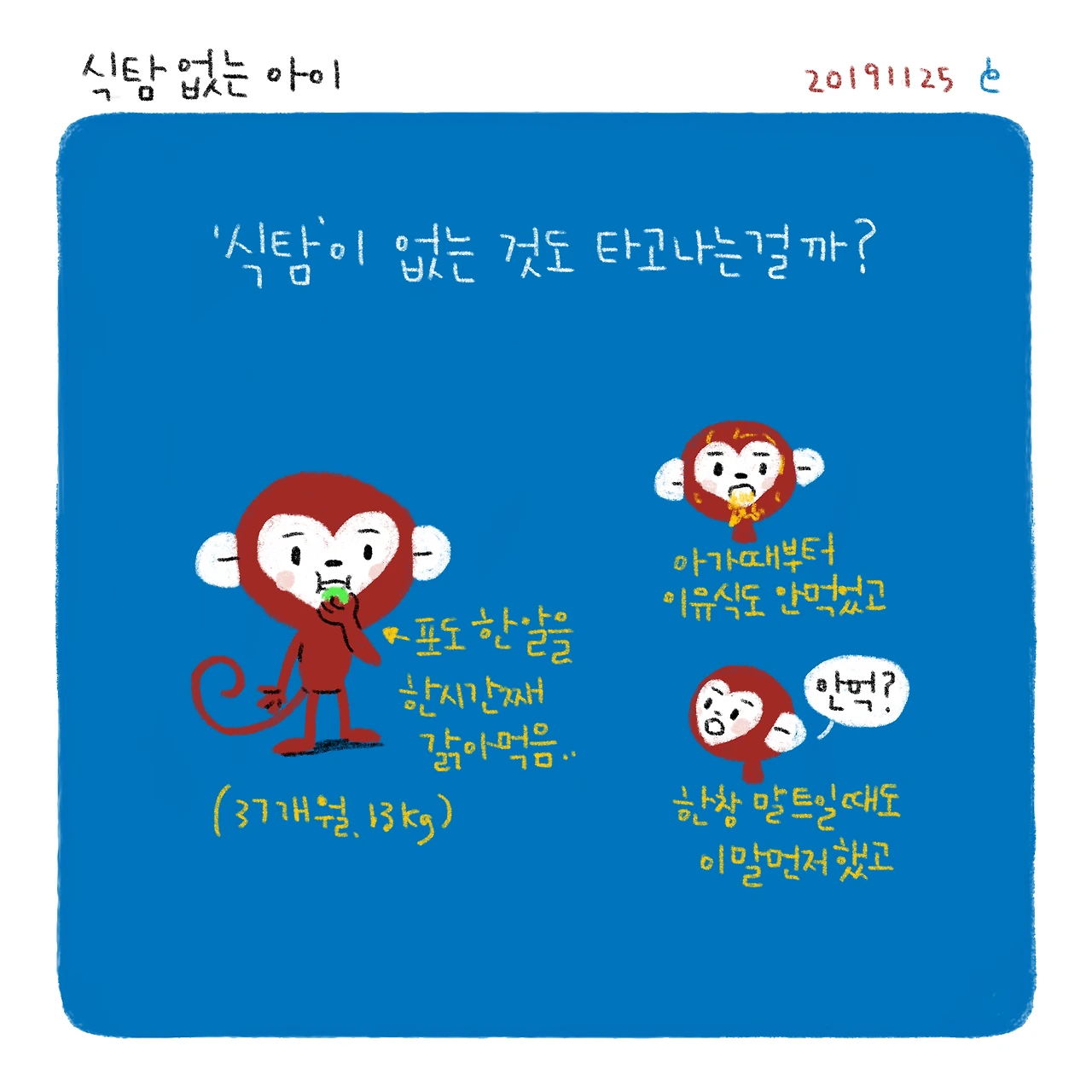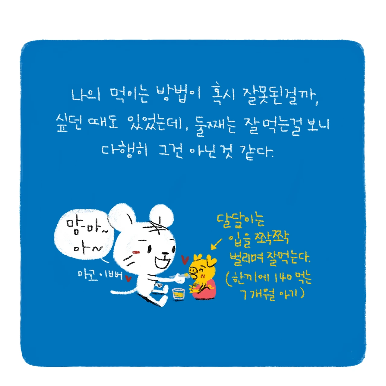 그래도 밥 잘 안먹는걸 빼면 흠 잡을게 하나도 없는 슉슉이다ㅠㅠ(사실 엄빠가 작은편이라 키랑 몸무게 적게 나가는 것도 유전이겠거니 하곤 있다..ㅎㅎ)-#블루챔버 #bluechamber #그림일기 #육아일기 #일상툰 #남매맘 #애둘맘 #37개월어린이 #7개월아기 #식탐없는아이