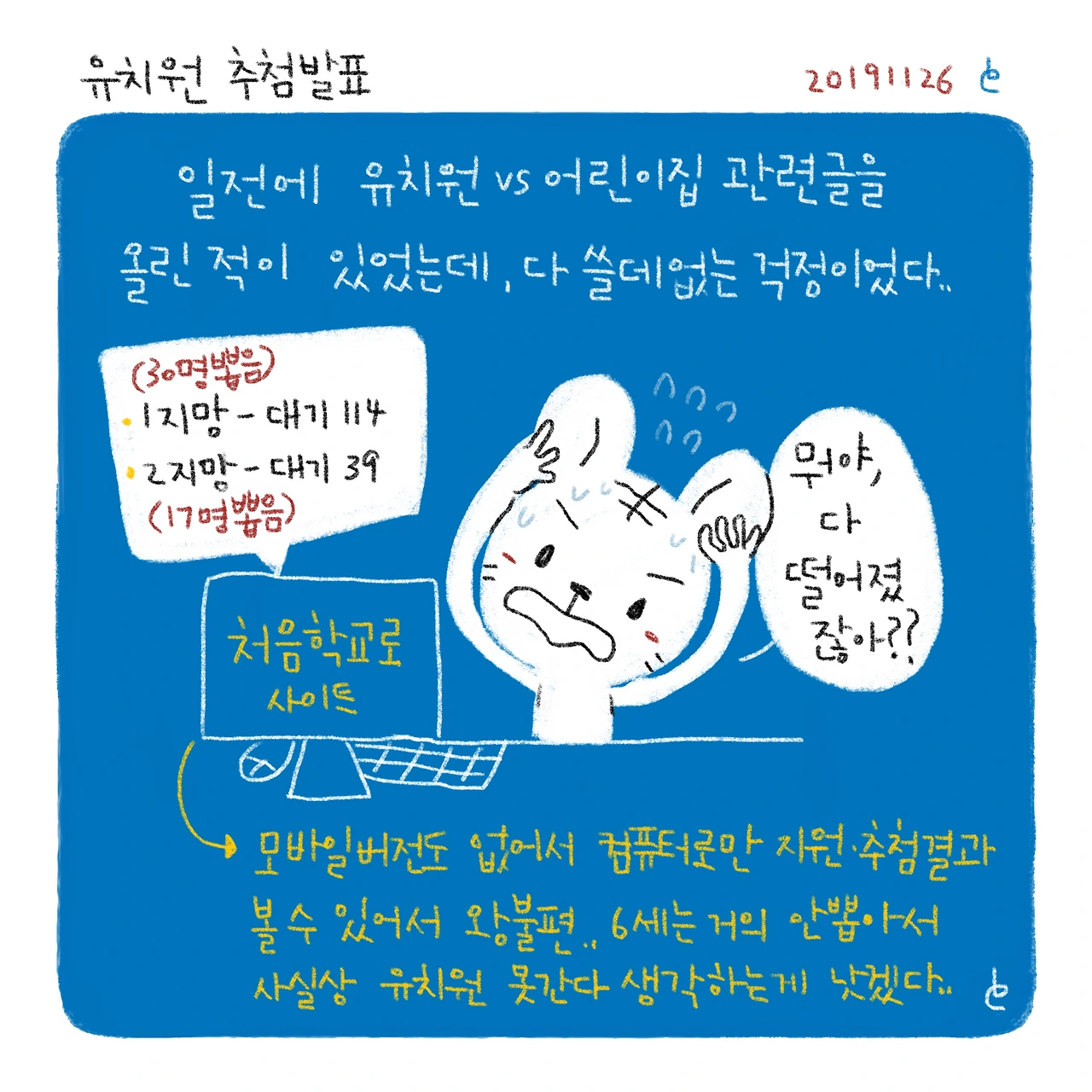기대할 대기번호도 아니라서 사실상 포기..어린이집 재원비 2만원 낸게 아깝지않게 되었다..-#블루챔버 #bluechamber #그림일기 #육아일기 #일상툰 #남매맘 #애둘맘 #37개월어린이 #7개월아기 #유치원추첨발표