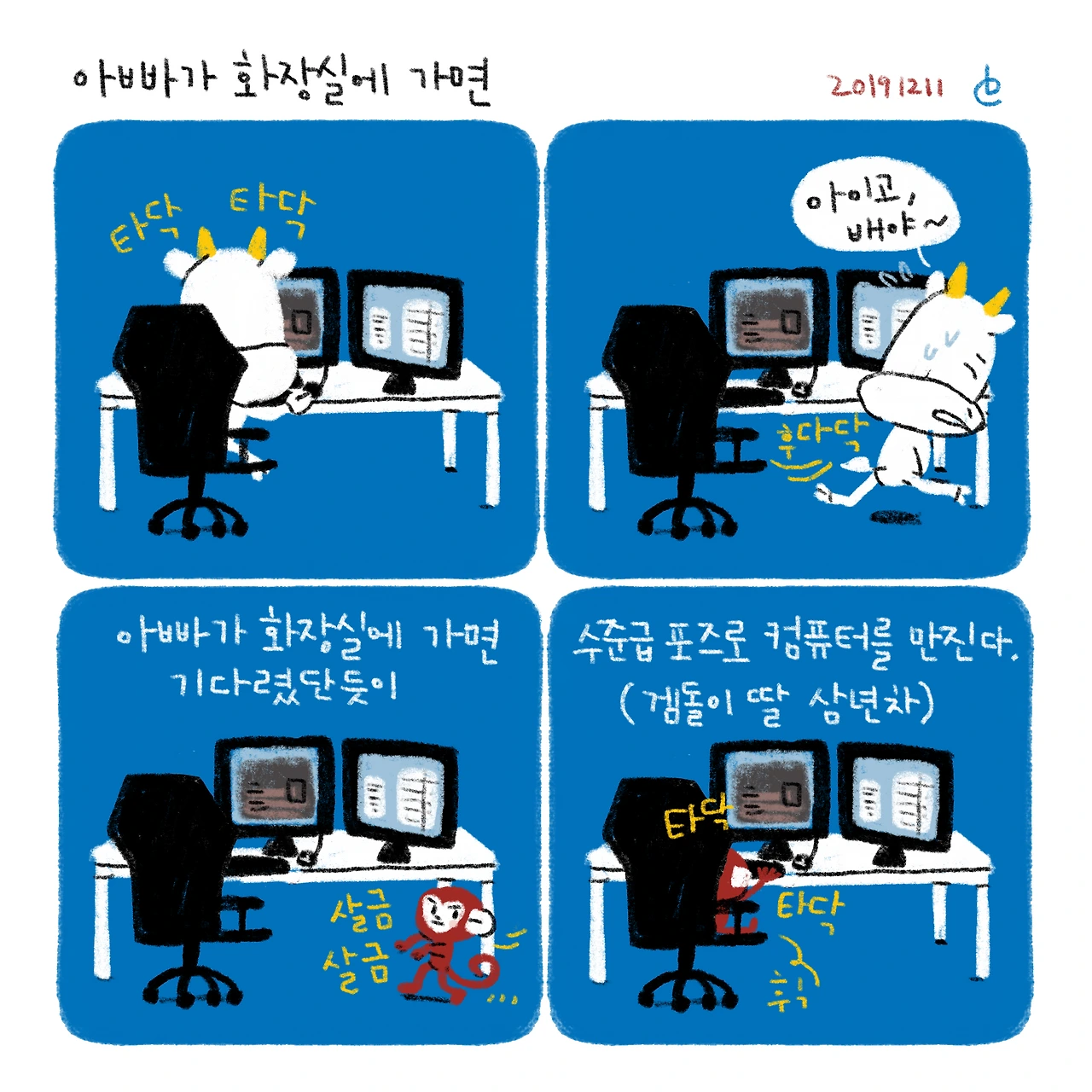서당개 삼년이면 풍월을 읊고,겜돌이 딸 삼년이면 컴터를 한다..-#블루챔버 #bluechamber #그림일기 #육아일기 #일상툰 #남매맘 #애둘맘 #38개월어린이 #8개월아기 #아빠가화장실에가면 #겜돌이딸의숙명