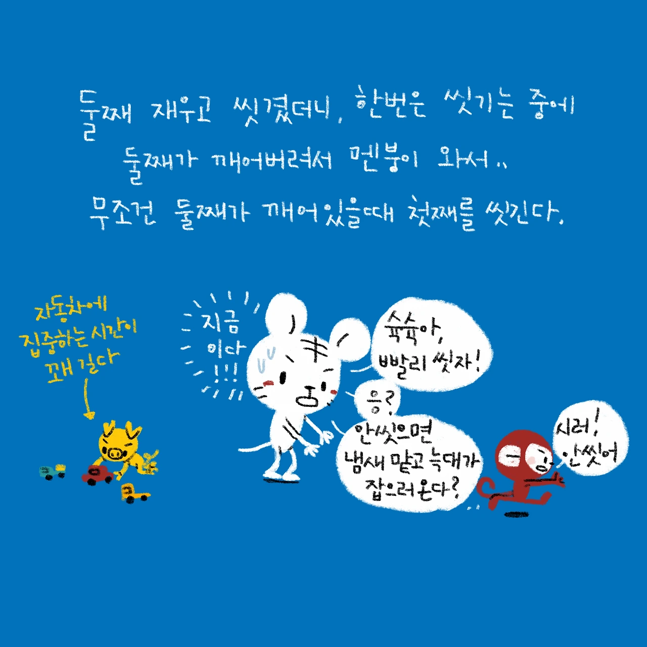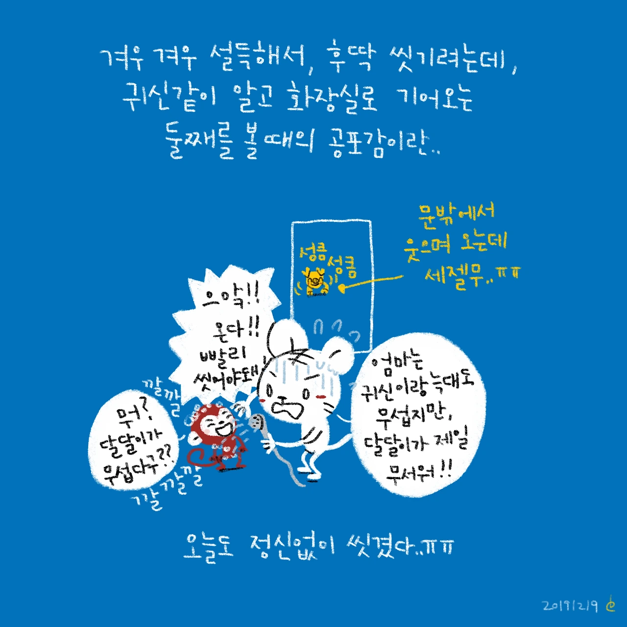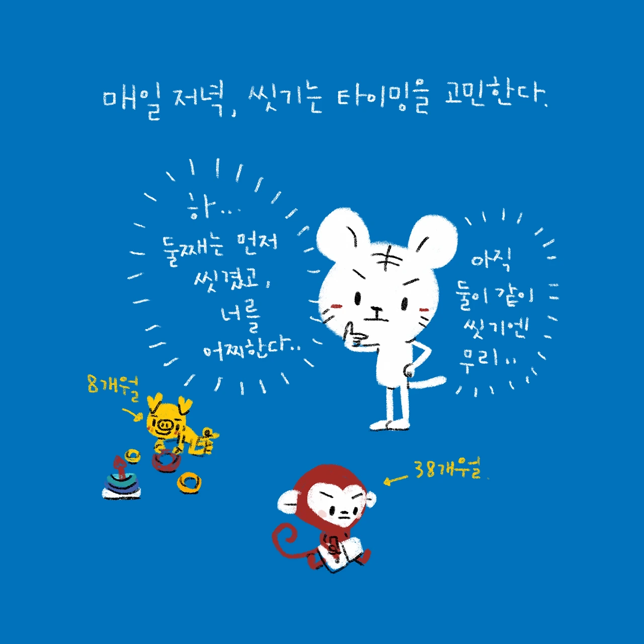 “엄마는 달달이가! (한템포 쉬고) 제일 무서워!!”이 말에 깔깔깔 너무 웃기다고 웃어주는걸 보니 다 크긴 한듯ㅋㅋ이제 혼자 씻어줄래? 다 컸으니깐...-#블루챔버 #bluechamber #그림일기 #육아일기 #일상툰 #남매맘 #애둘맘 #38개월어린이 #8개월아기 #첫째를씻기는타이밍