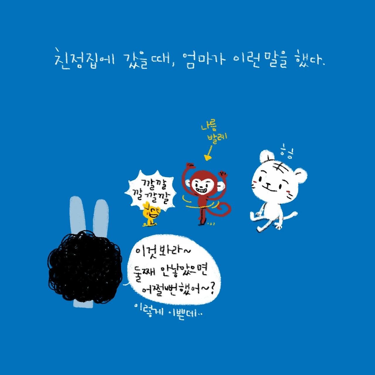 이제는 철딱서니없이 애만 많이 낳은 흥부가 동냥까지 하러온걸 보고 밥주걱으로 뺨을 후려친 놀부부인의 마음이 이해가 되죠..흥부 부인은 뭔 죄야-#블루챔버 #bluechamber #그림일기 #육아일기 #일상툰 #남매맘 #애둘맘 #39개월어린이 #9개월아기 #둘째안낳았으면어쩔뻔했어