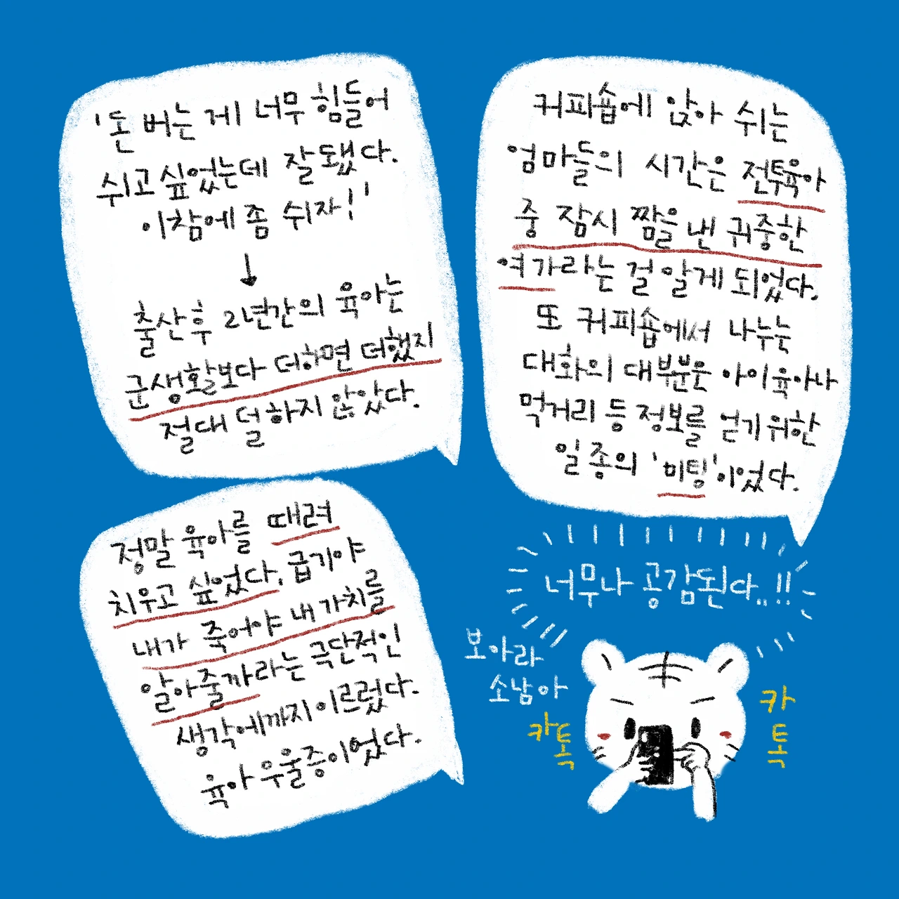사실 나도 아이를 낳고 혼자서 케어해보기 전까진 이런 힘듦을 몰랐었다.(딱히 알아야 할 이유도 없었다.)