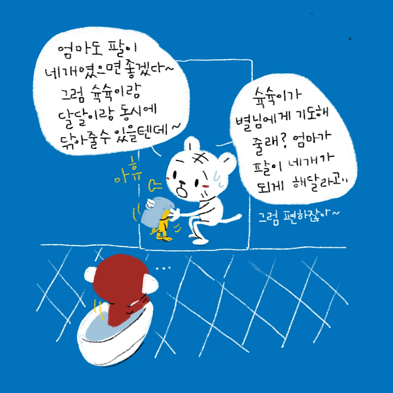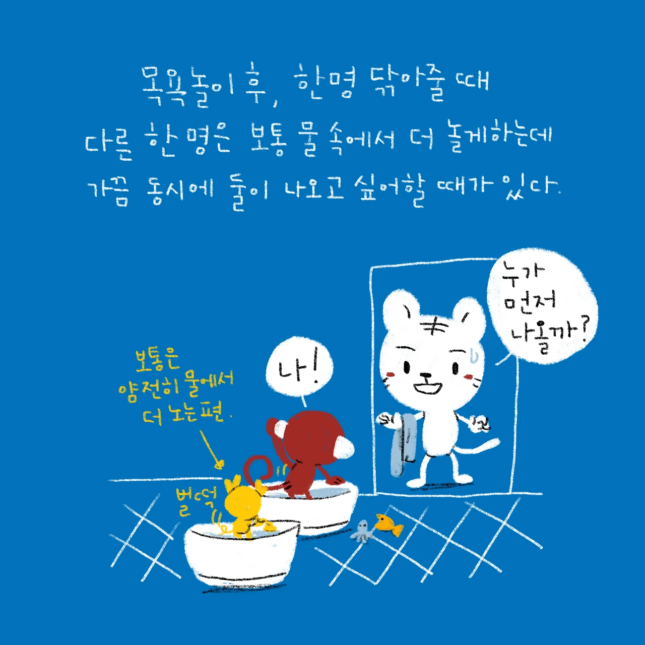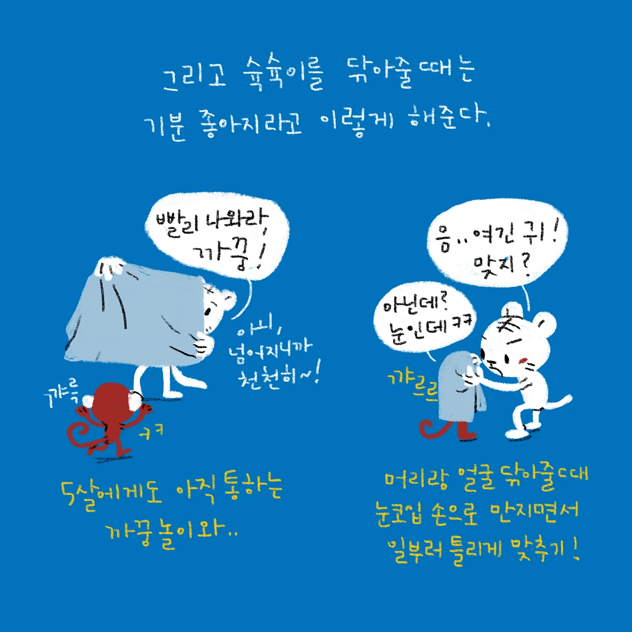 어른들은 잘 안 받아주는 유치개그가 5살 슉슉이에게는 너무 잘 통해서, 요즘 물 만난 고기처럼 슉슉이에게 웃음보따리를 풀어주고 있다.-#블루챔버 #bluechamber #그림일기 #육아일기 #일상툰 #남매맘 #애둘맘 #43개월어린이 #14개월아기 #목욕놀이후둘이동시에