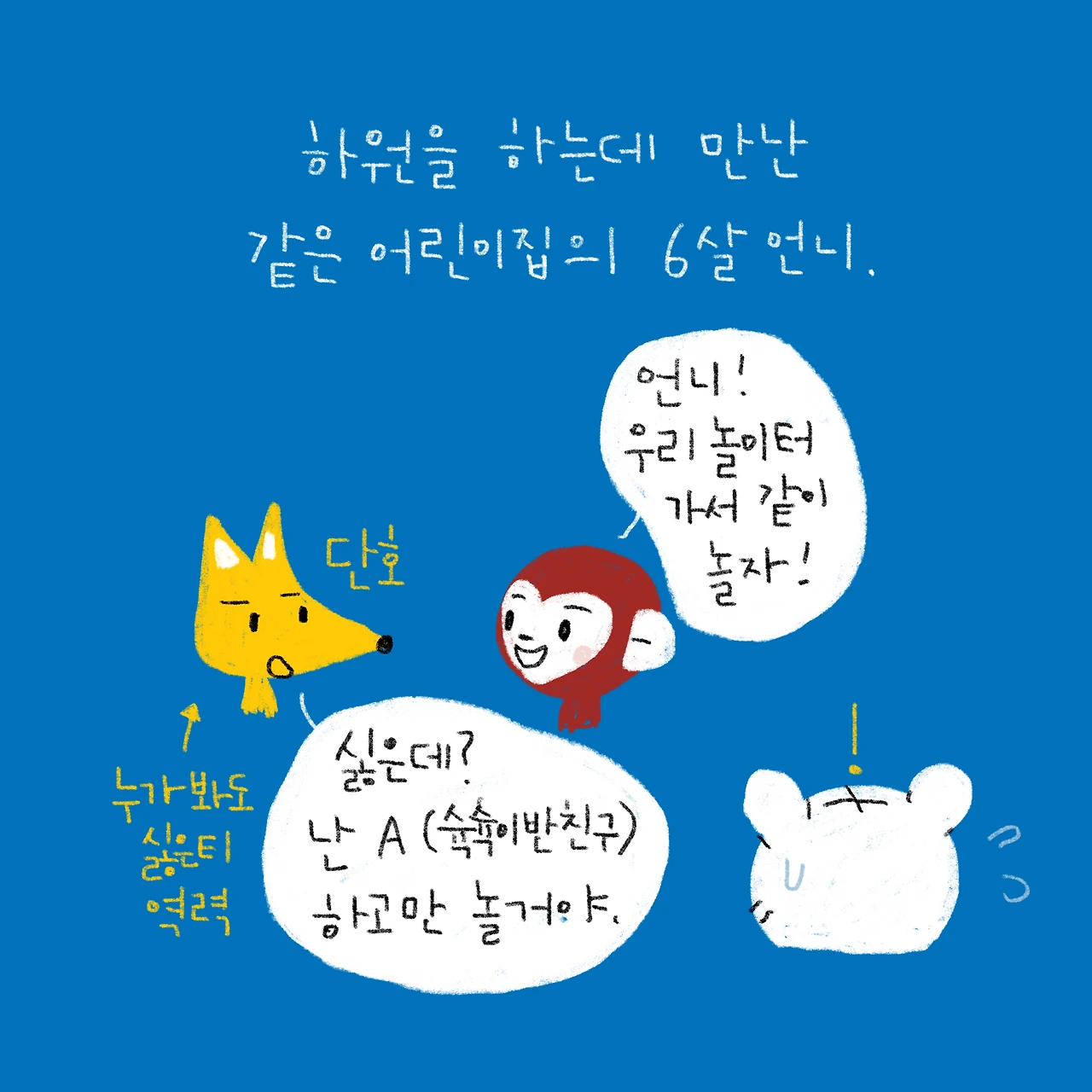 ‘너랑 안놀고 싶어하면 굳이 너도 같이 놀 필요없어, 너랑 놀고 싶어하는 다른 친구랑 놀면 돼~’ 라고 말해주긴 했는데ㅋㅋ
