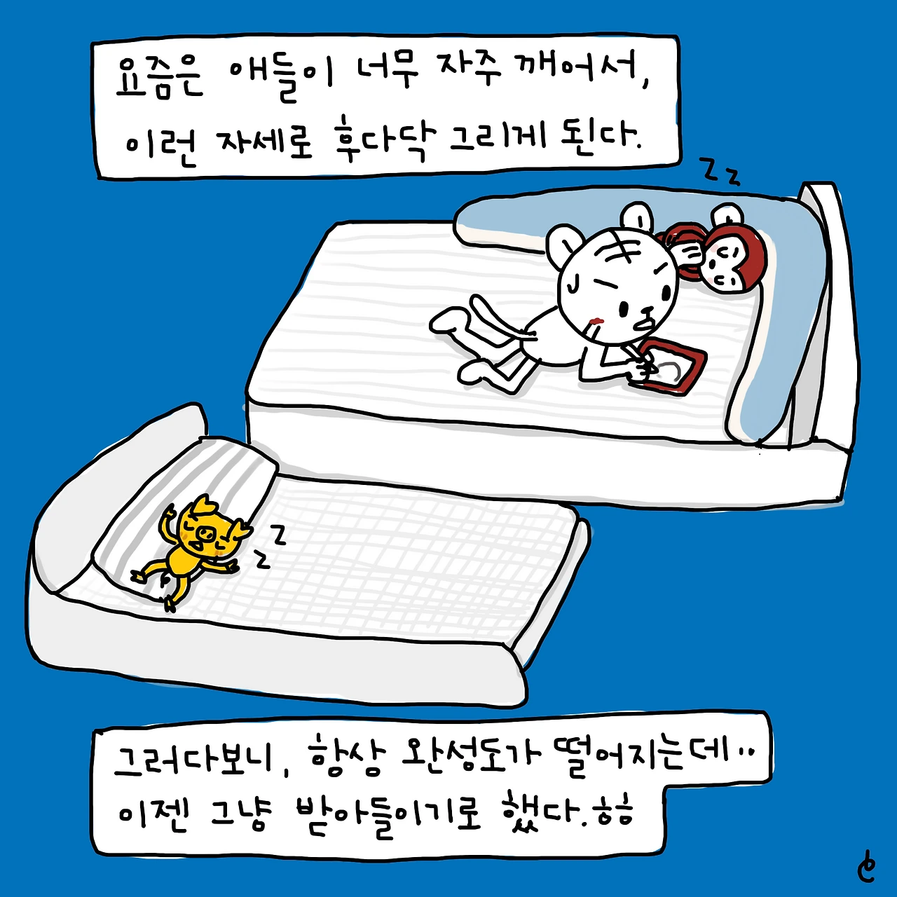 처음엔 밑에서 셋이 자다가 결국은 이렇게 된다. 왼손으론 슉슉이 토닥토닥해주며 오른손으로만.. 후다닥 그림의 선두주자ㅋㅋㅋ 나야나! - #블루챔버 #bluechamber #그림일기 #육아일기 #일상툰 #남매맘 #애둘맘 #47개월어린이 #17개월아기 #2살아기 #5살어린이 #요즘애들재우고그릴때모습