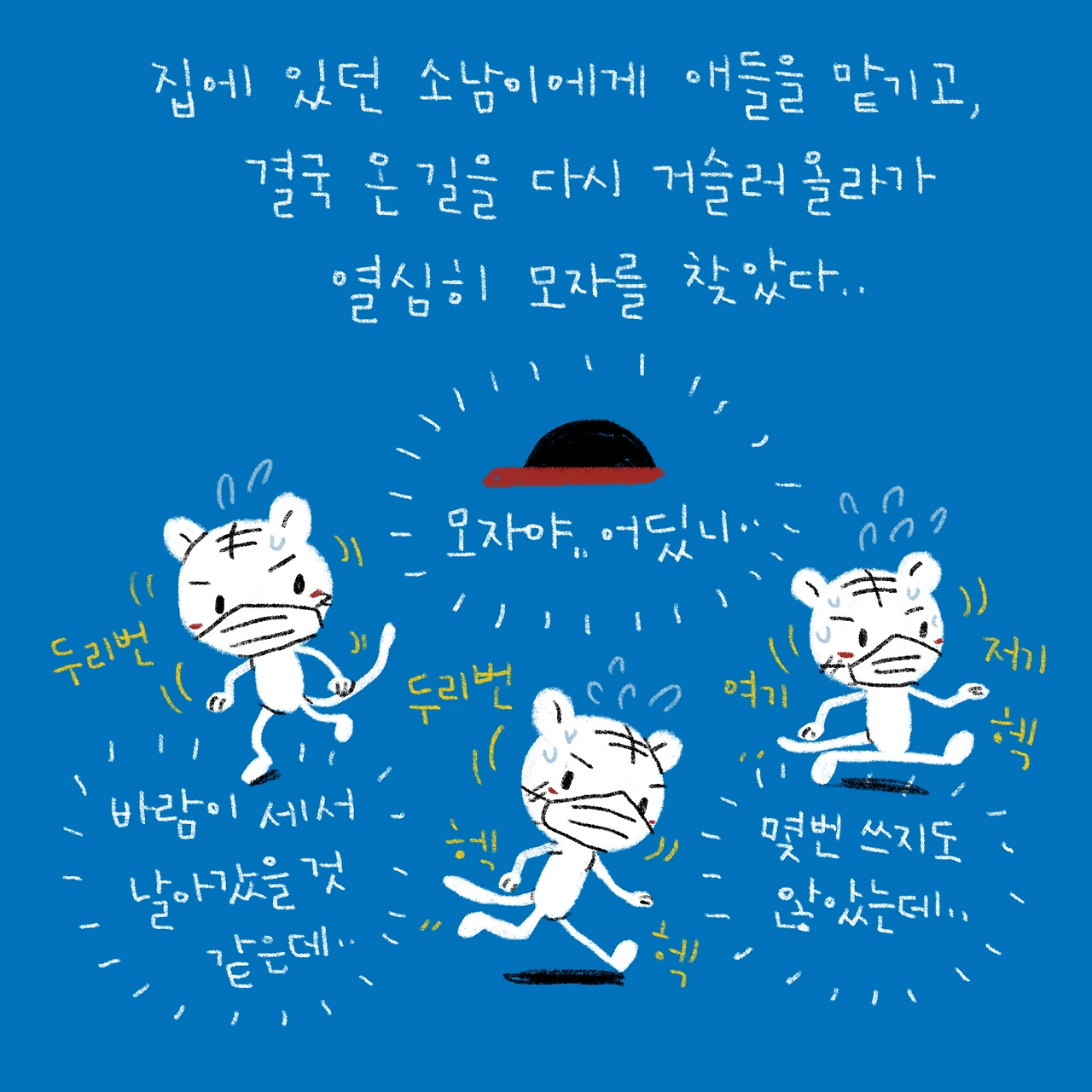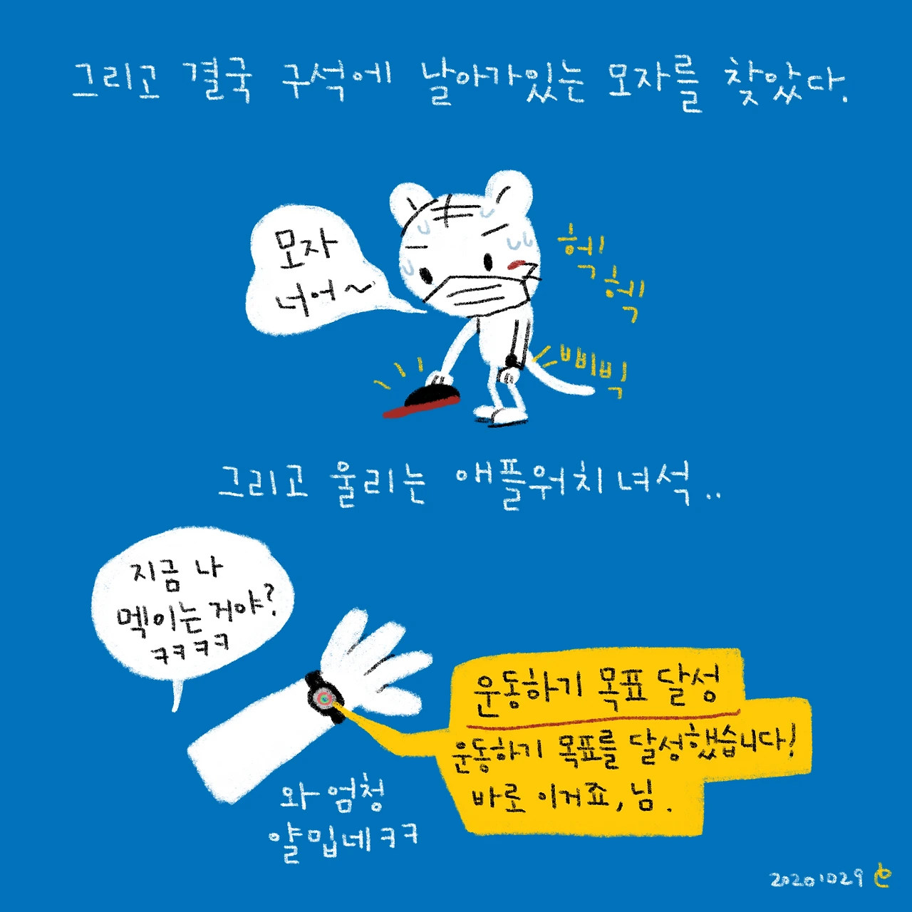 딱 모자 찾자마자 울려서 진짜ㅋㅋㅋ 완전 어이없었다.-사진은 문제의 모자와, 애플워치 알림이랑 슉슉이 이번에 킥보드에 달아준 유니콘 머리(..!이뻐서 올려봄ㅋㅋ)-#블루챔버 #bluechamber #그림일기 #육아일기 #일상툰 #남매맘 #애둘맘 #48개월어린이 #19개월아기 #2살아기 #5살어린이 #달달이의모자
