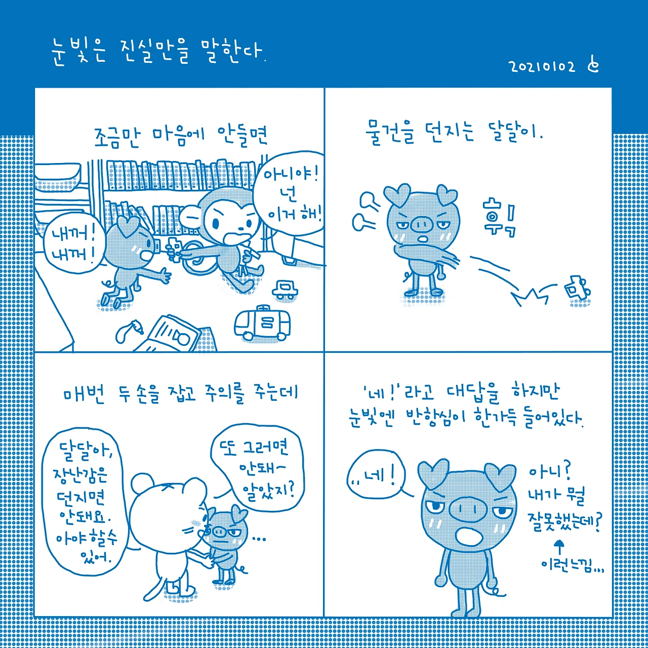마지못해 ‘네!’ 대답하고 상황 모면하는 느낌.눈빛은 너무나도 ‘아니오’ 인데 일단은 대답했으니 넘어가준다.벌써부터 사춘기가 두려워지는 달달이(..)-#블루챔버 #bluechamber #그림일기 #육아일기 #일상툰 #남매맘 #애둘맘 #50개월어린이 #21개월아기 #3살아기 #6살어린이 #눈빛은진실만을말한다