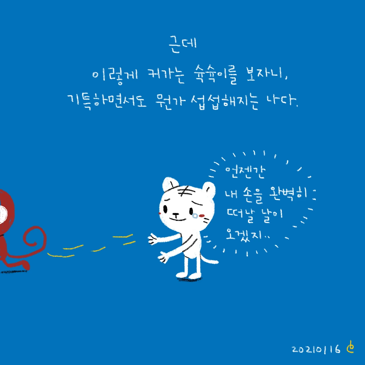 슉슉이의 손 많이 가는 시기가 지나가고 있다.그게 느껴진다.참 신기하다.점점 더 독립적으로 변할 슉슉이를 응원해줘야하는데...나중엔 내가 슉슉이껌딱지가 될 것 같다.ㅠㅠ-#블루챔버 #bluechamber #그림일기 #육아일기 #일상툰 #남매맘 #애둘맘 #51개월어린이 #21개월아기 #3살아기 #6살어린이 #6살이된슉슉이는