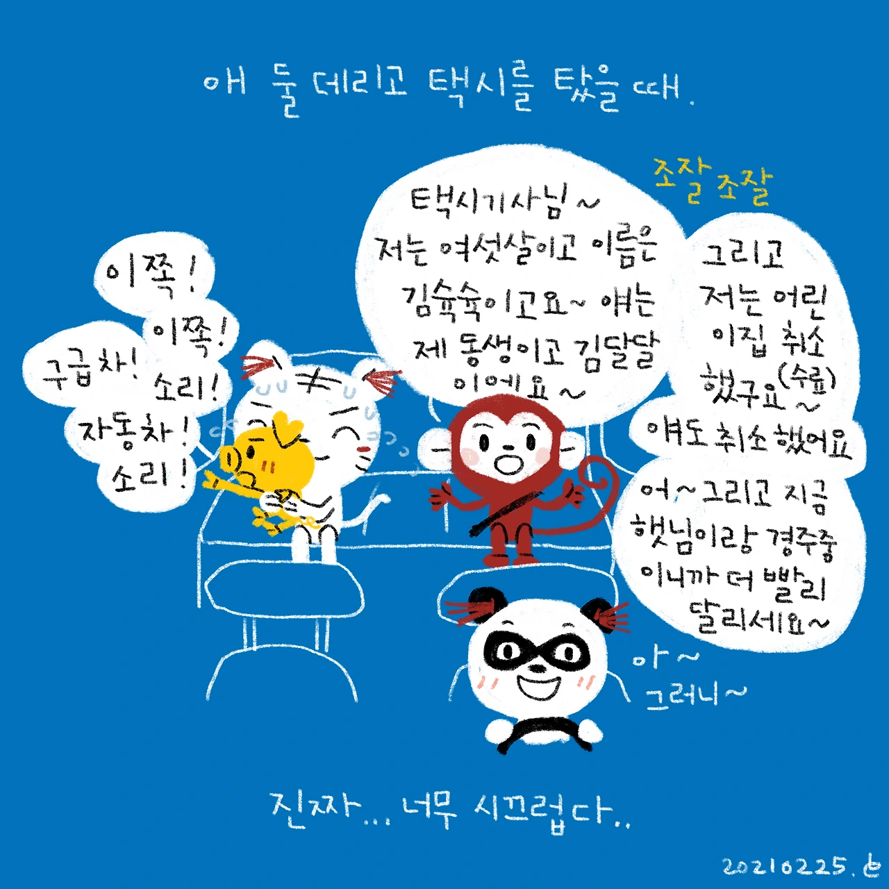 아무래도 제가 투머치토커를 낳은 것 같습니다..쉴 새 없이 저렇게 떠들줄이야..-#블루챔버 #bluechamber #그림일기 #육아일기 #일상툰 #남매맘 #애둘맘 #52개월어린이 #22개월아기 #3살아기 #6살어린이 #애둘데리고택시탔을때