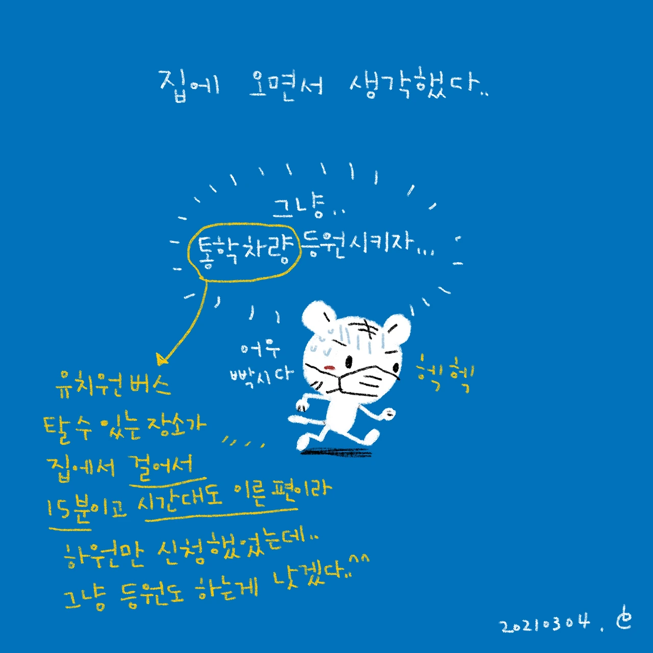 유치원 등원은 어린이집 첫 등원 때와는 느낌이 다른 것 같다. 걱정어린 눈물은 안나고 그냥 잘 할 것 같다는 느낌(?)이 든다.