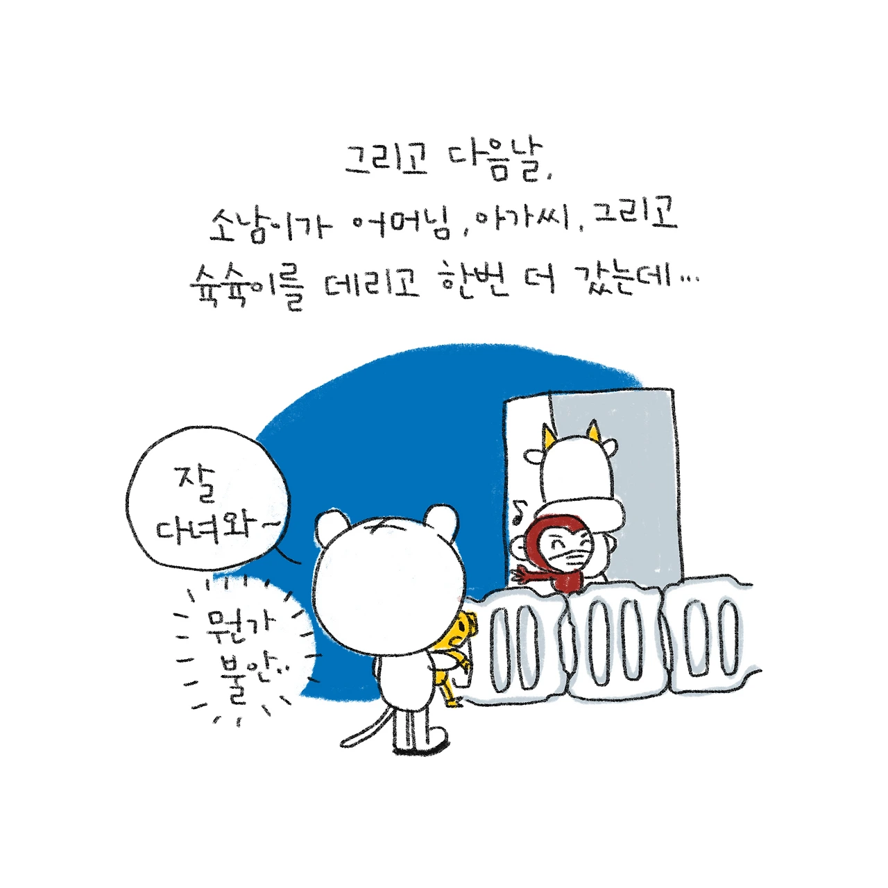소띠 아빠, 호랑이띠 엄마, 원숭이띠 딸, 돼지띠 아들. 소소한 육아와 일상 이야기를 그리고 있습니다.