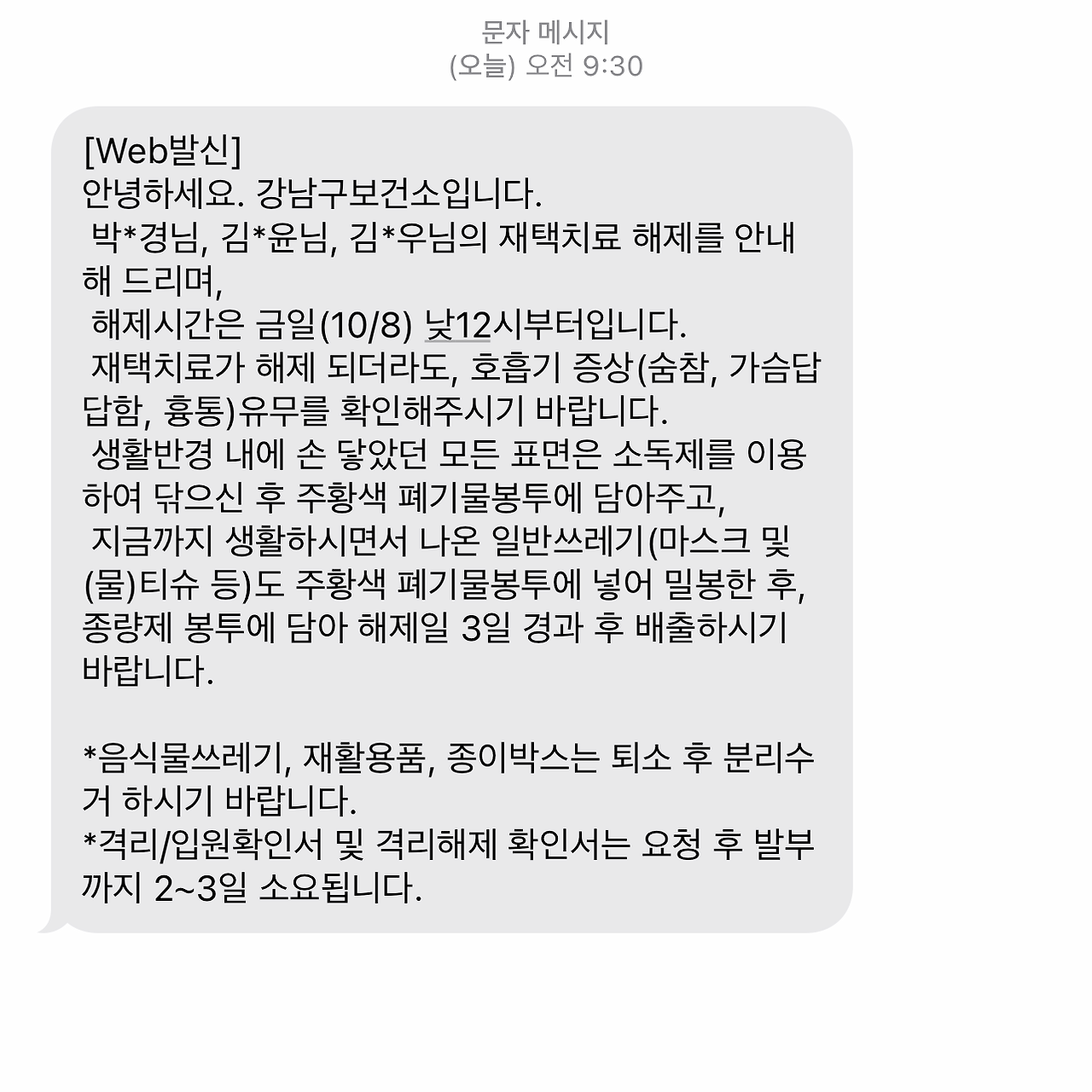 방금 보건소 전화 받고, 문자도 받았지요!!