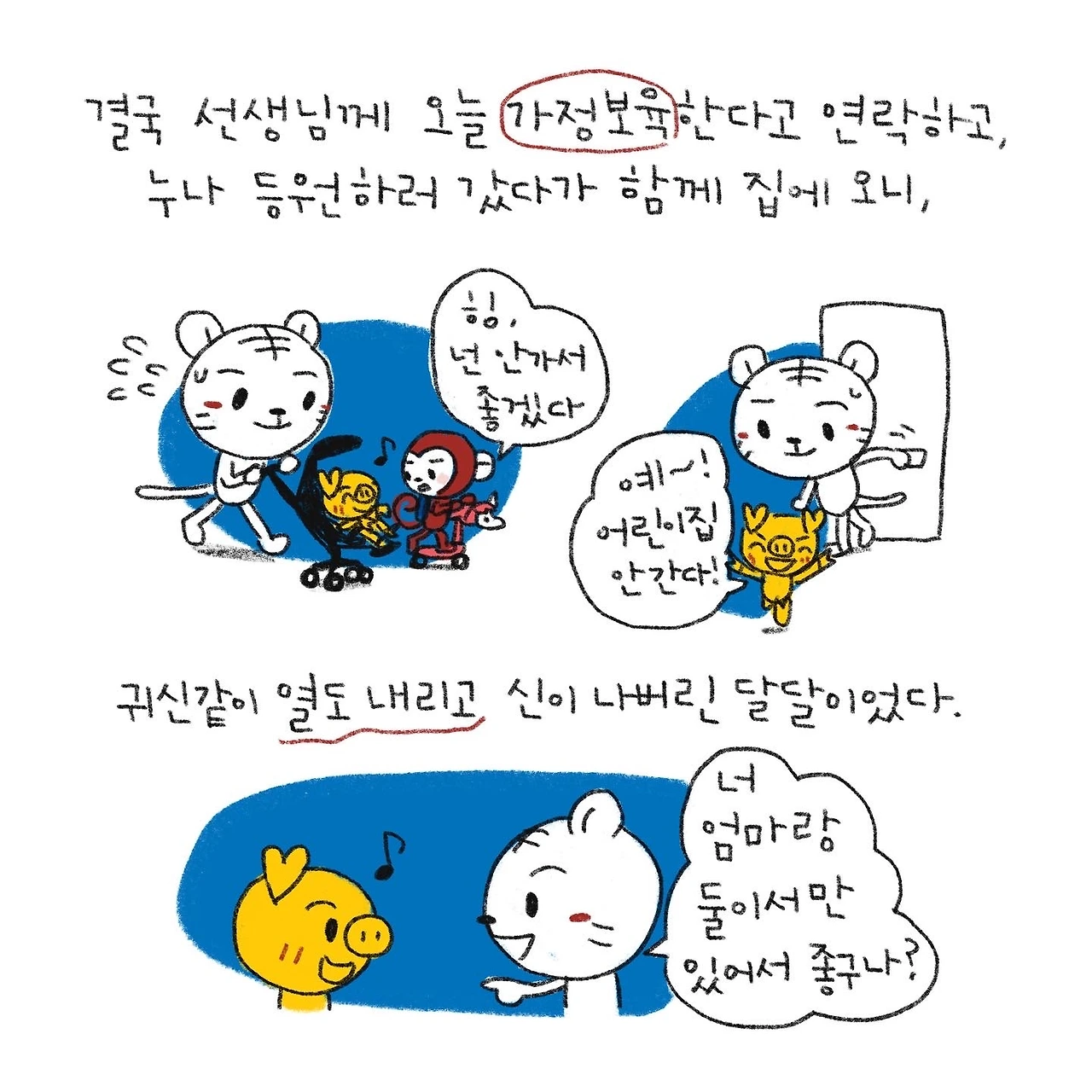 소띠 아빠, 호랑이띠 엄마, 원숭이띠 딸, 돼지띠 아들. 소소한 육아와 일상 이야기를 그리고 있습니다.