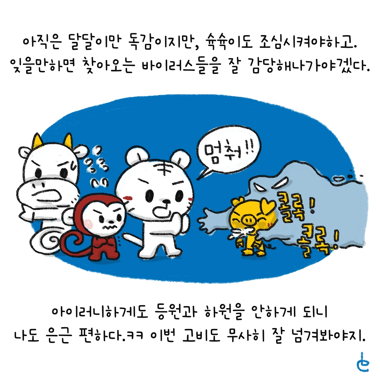 소띠 아빠, 호랑이띠 엄마, 원숭이띠 딸, 돼지띠 아들. 소소한 육아와 일상 이야기를 그리고 있습니다.